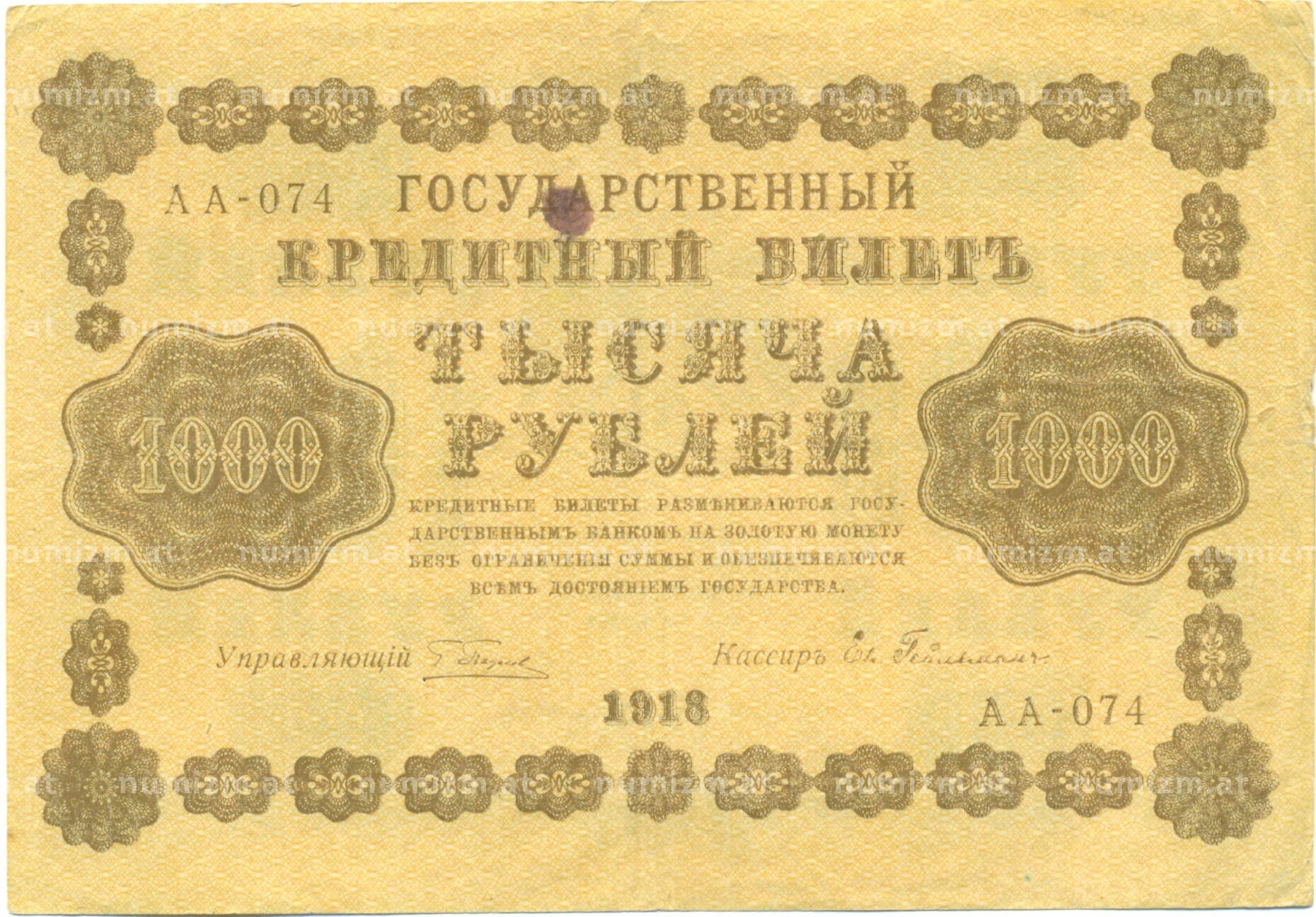 20.01.2025Интернет магазин «Нумизмат» предлагает приобрести 1000 рублей 1918 года.