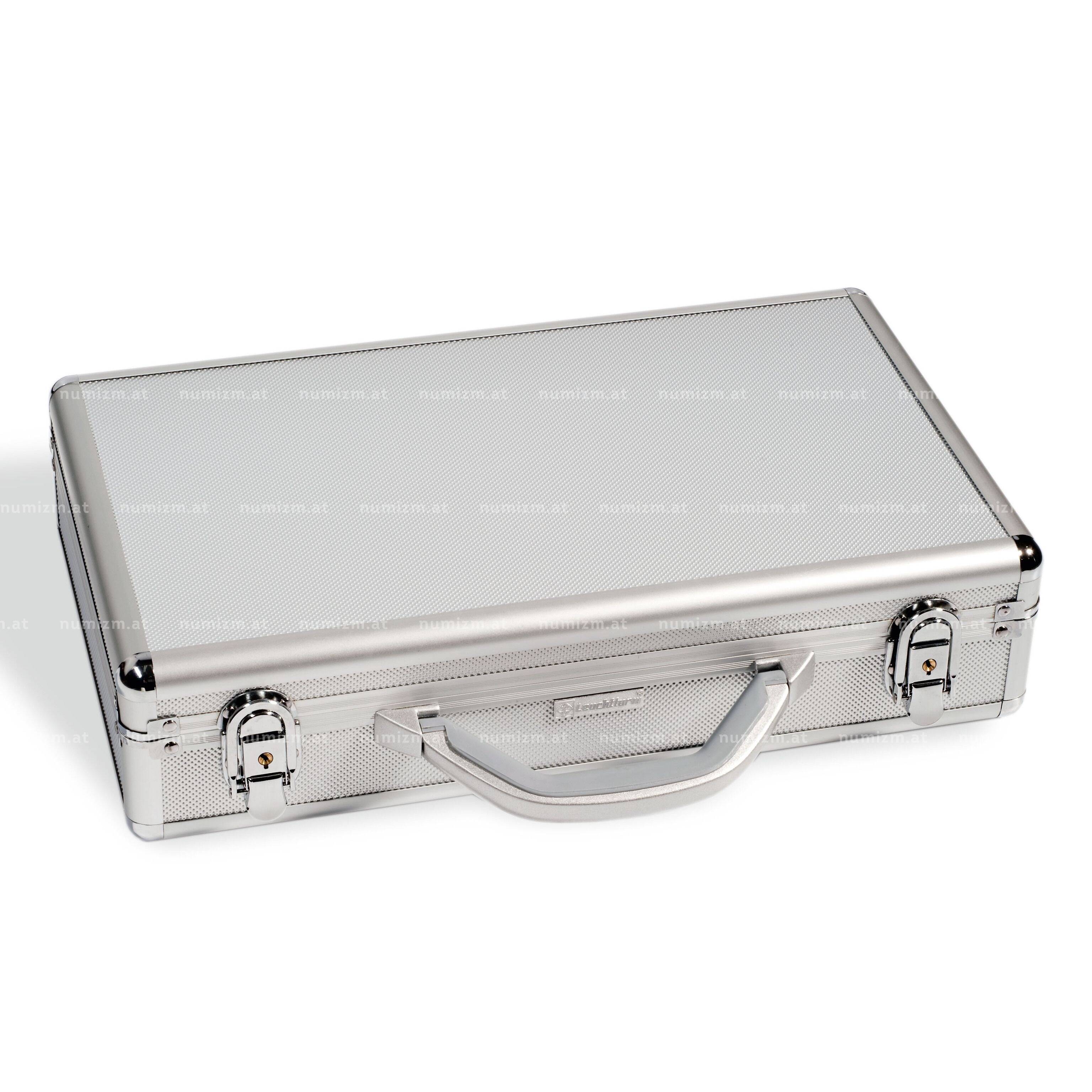 Крышка с мягкой обивкой. Внутренняя обшивка из черного велюра. Закрывается на замок (2 ключа). Металлические уголки. Наружный формат: 407x95x245 мм. Содержит 2 планшета для 40 монет (302392), 2 планшета для 35 монет (331597), 2 планшета для 24 монет (324301).