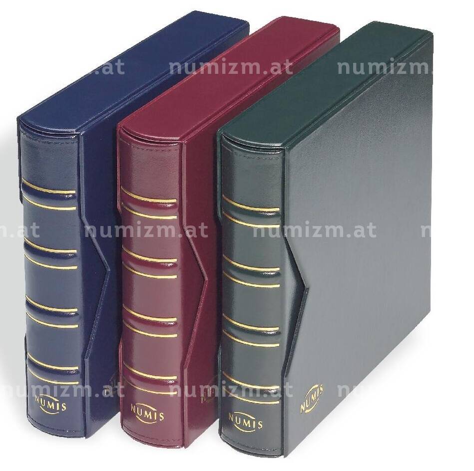 Альбом для банкнот формата «Нумис» классического дизайна с 10 листами «Нумис» (193х217 мм) на 2 и 3 ячейки. (Всего вмещает примерно 50 листов с банкнотами). Кожзаменитель. В футляре. Прочный 4-кольцевой механизм.Габаритные размеры: 230х235 мм.