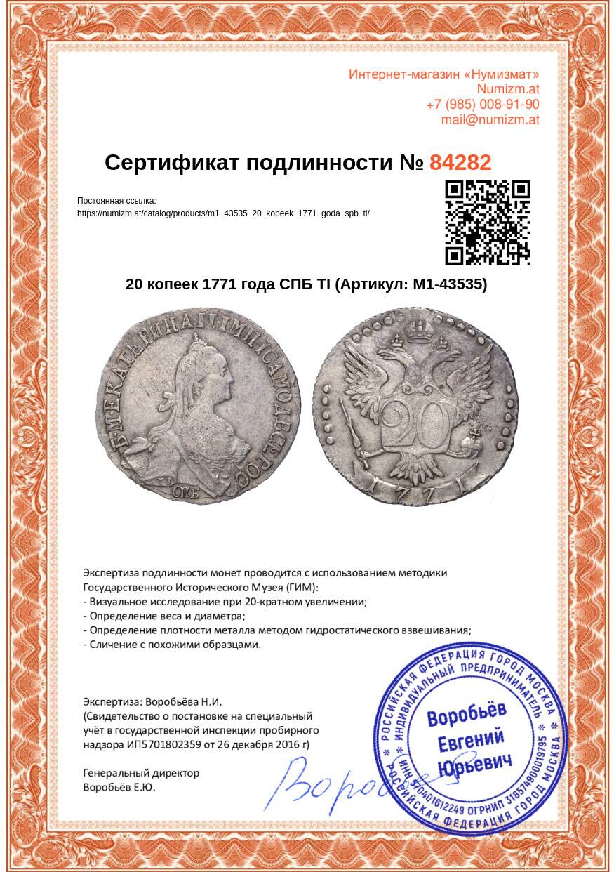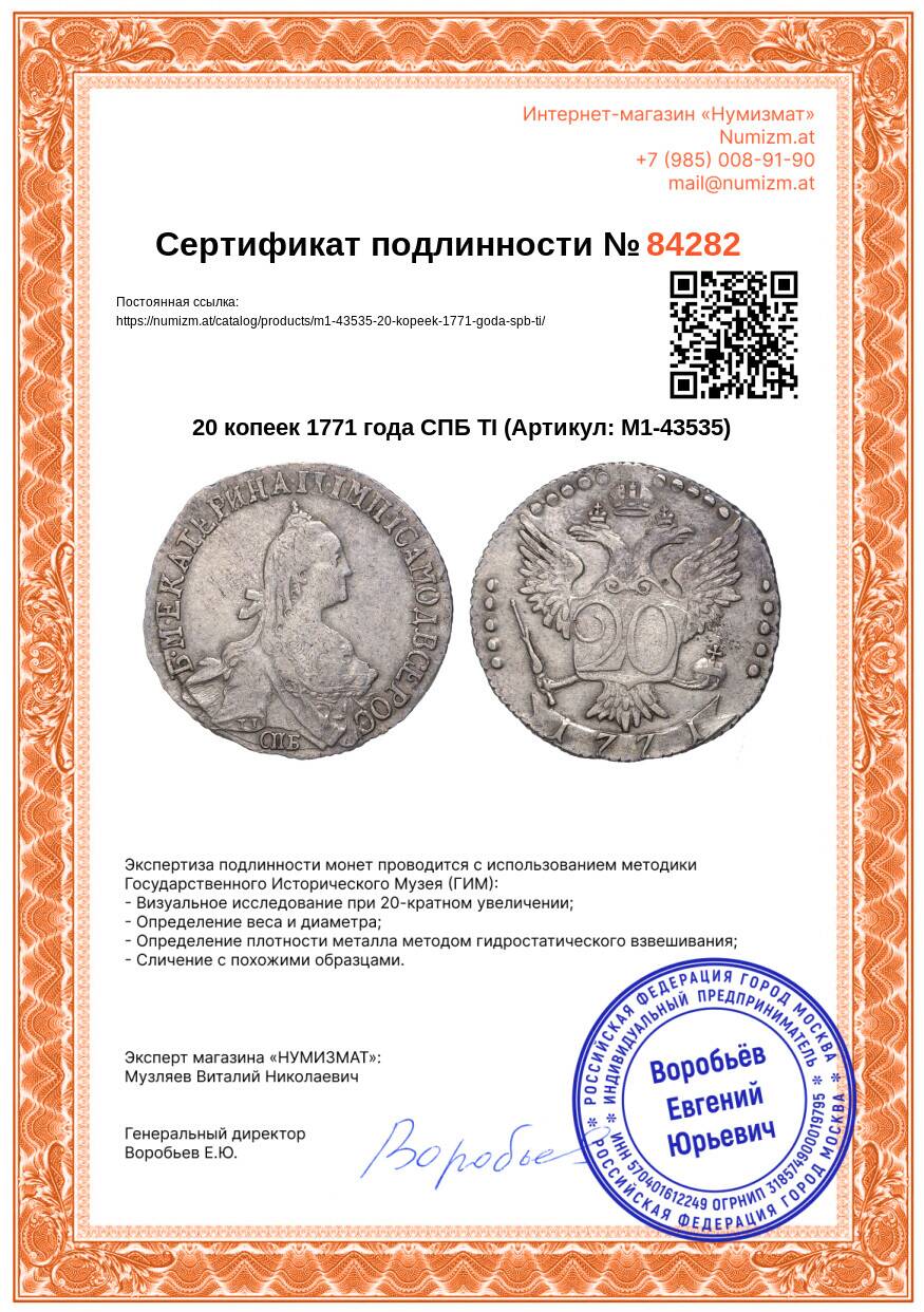 20.01.2025Интернет магазин «Нумизмат» предлагает приобрести 20 копеек 1771 года СПБ ТI.
