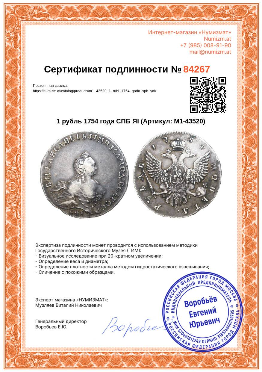 20.01.2025Интернет магазин «Нумизмат» предлагает приобрести 1 рубль 1754 года СПБ ЯI.