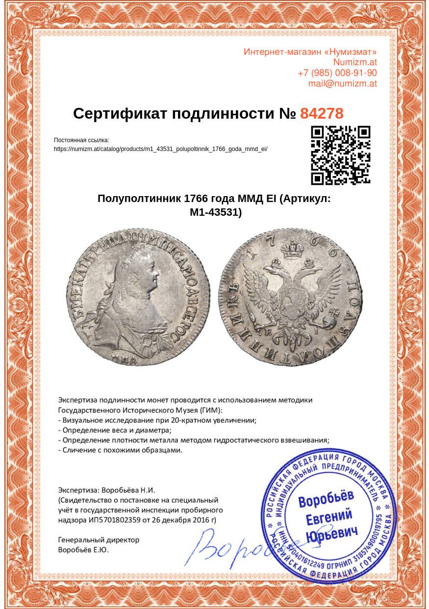 Купить Полуполтинник 1766 года ММД ЕI по привлекательной цене можно в нашем интернет-магазине — Вам достаточно оформить заказ на сайте. Все монеты, представленные в каталоге, находятся в наличии на нашем складе.