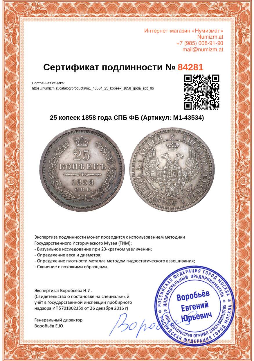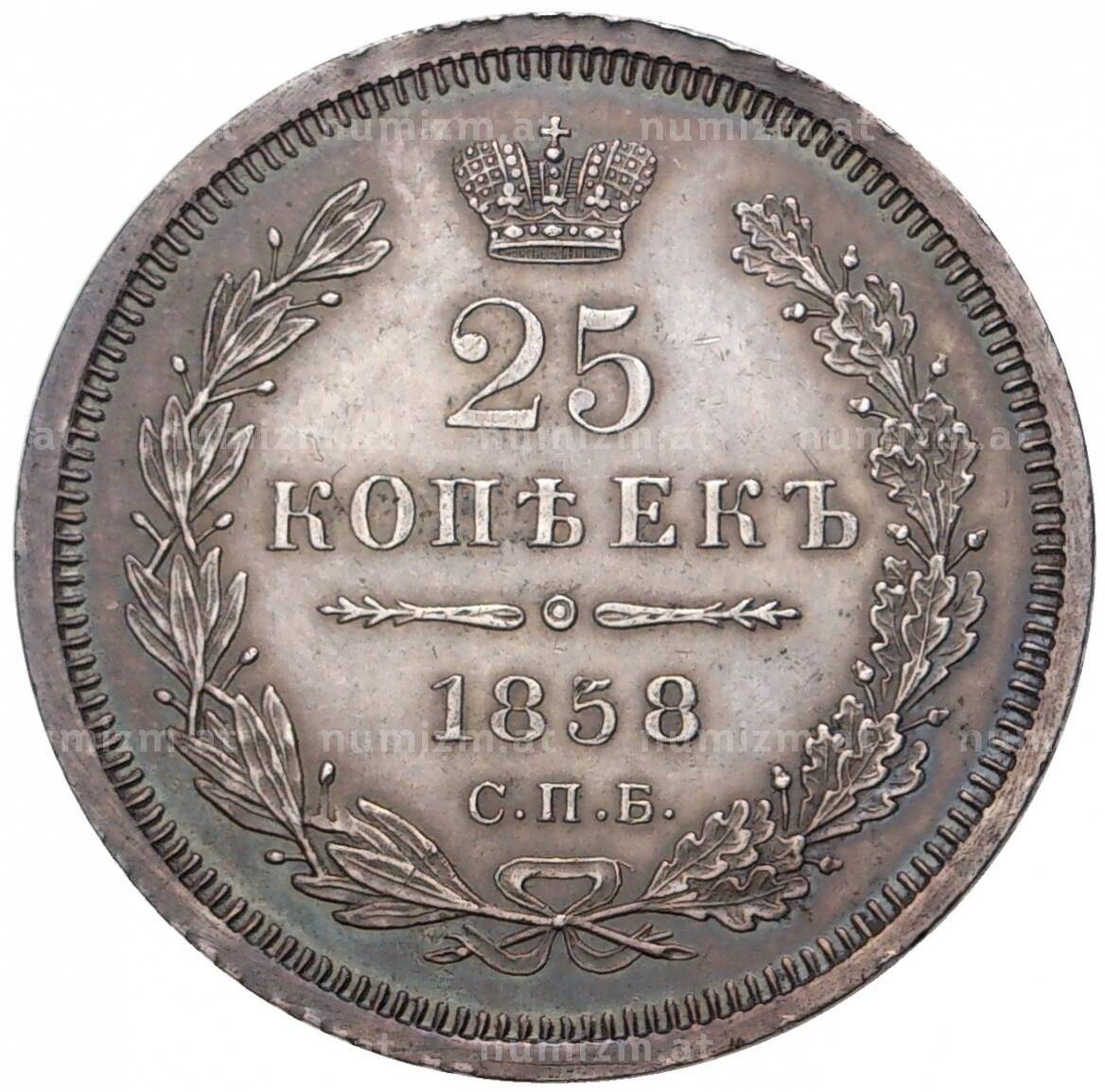 20.01.2025Интернет магазин «Нумизмат» предлагает приобрести 25 копеек 1858 года СПБ ФБ.