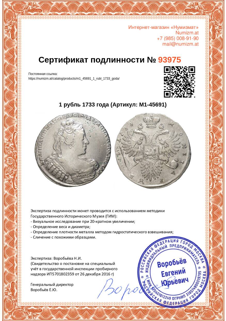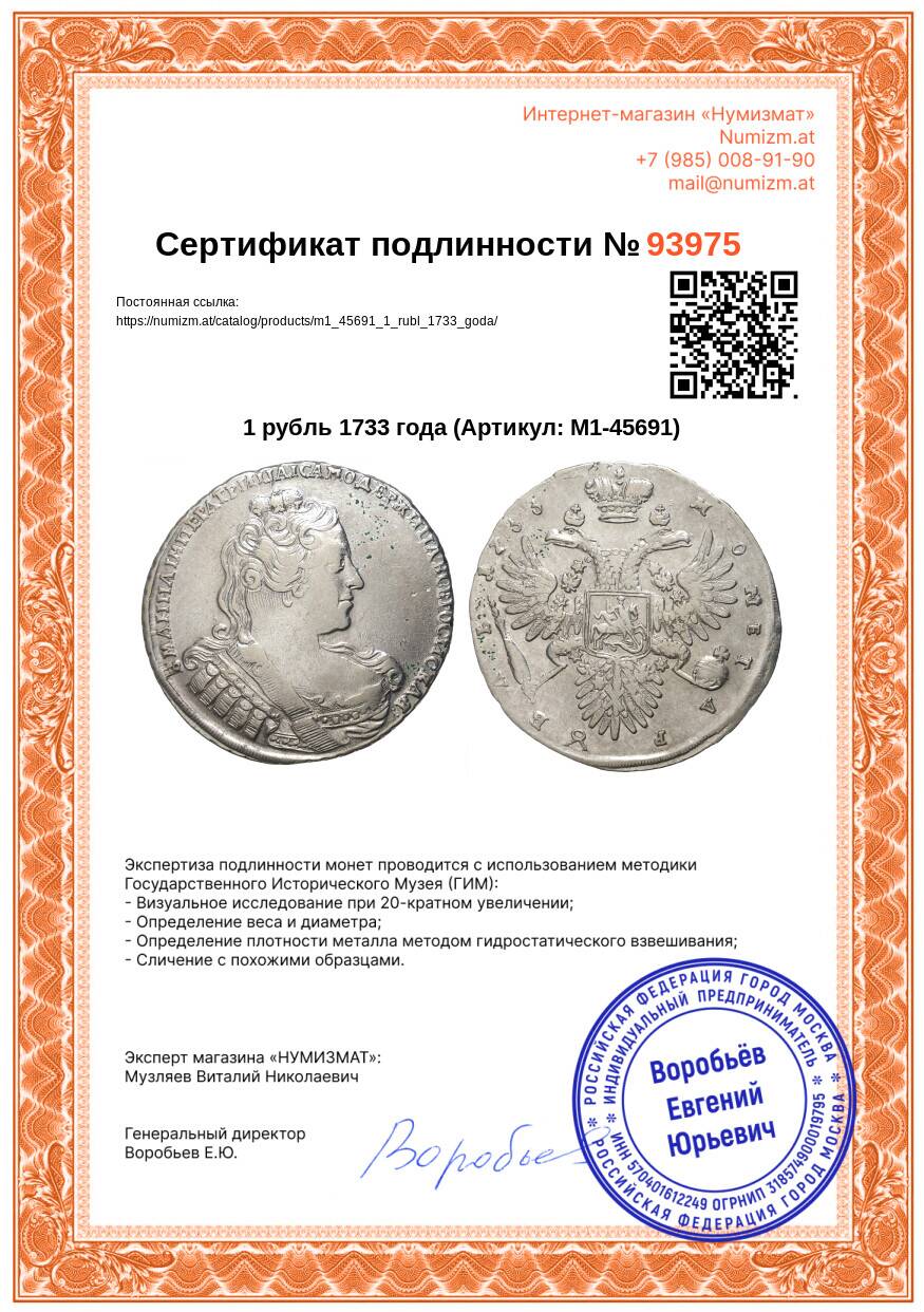 Купить 1 рубль 1733 года по привлекательной цене можно в нашем интернет-магазине — Вам достаточно оформить заказ на сайте. Все монеты, представленные в каталоге, находятся в наличии на нашем складе.