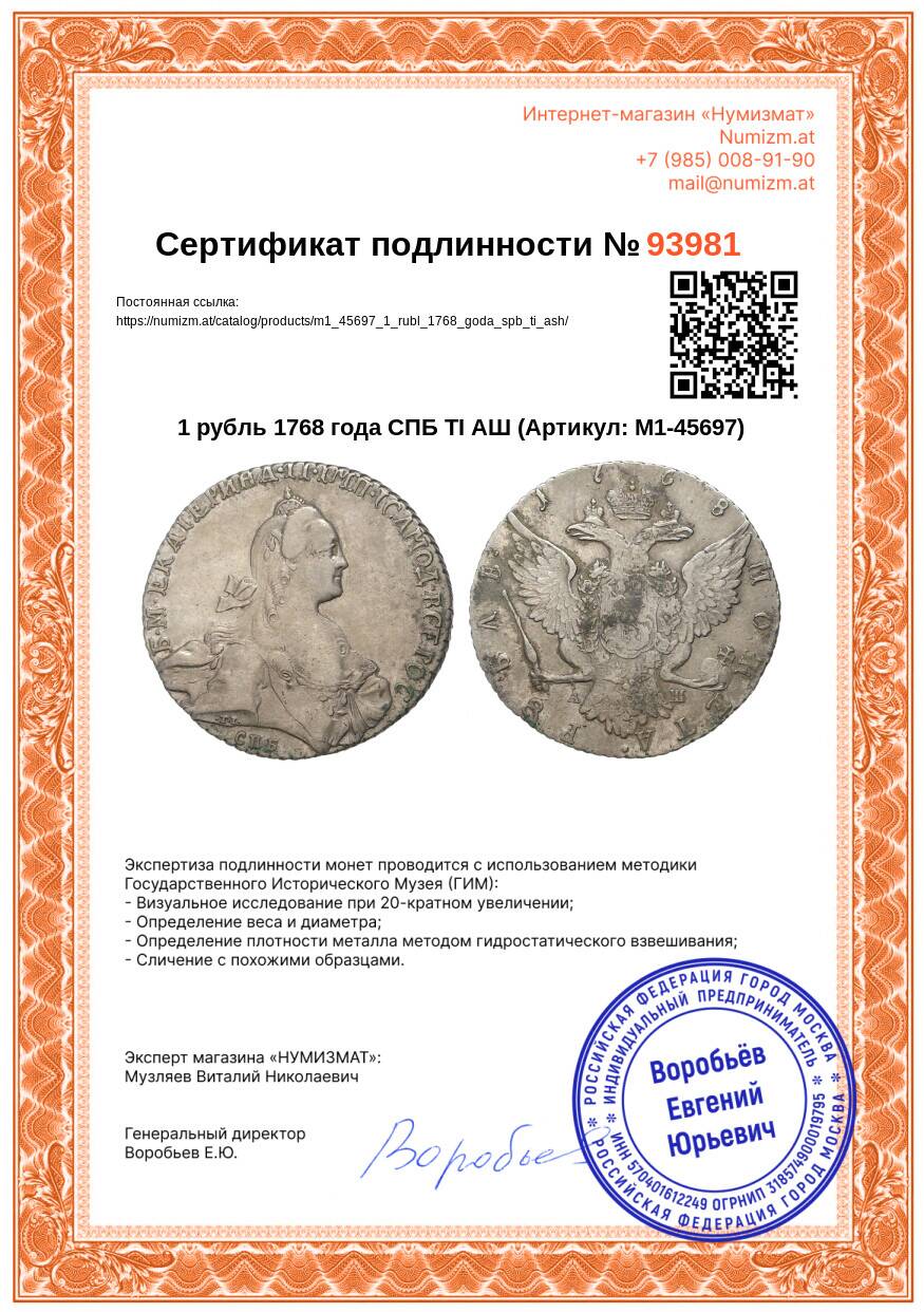 Купить 1 рубль 1768 года СПБ ТI АШ по привлекательной цене можно в нашем интернет-магазине — Вам достаточно оформить заказ на сайте. Все монеты, представленные в каталоге, находятся в наличии на нашем складе.