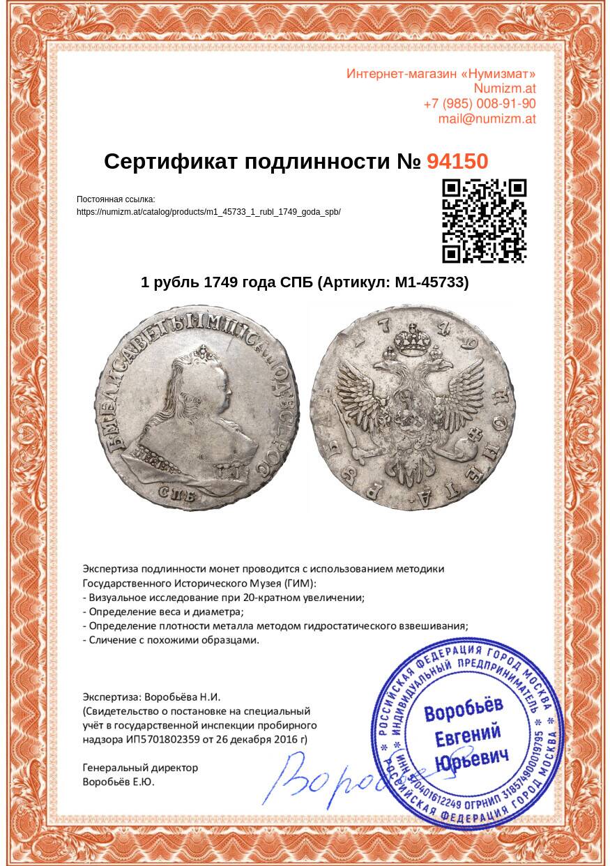 Купить 1 рубль 1749 года СПБ по привлекательной цене можно в нашем интернет-магазине — Вам достаточно оформить заказ на сайте. Все монеты, представленные в каталоге, находятся в наличии на нашем складе.