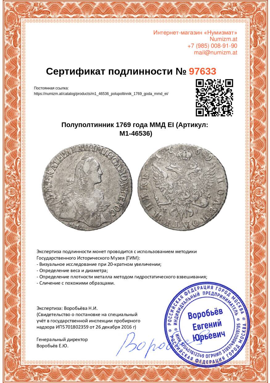 Купить Полуполтинник 1769 года ММД ЕI по привлекательной цене можно в нашем интернет-магазине — Вам достаточно оформить заказ на сайте. Все монеты, представленные в каталоге, находятся в наличии на нашем складе.
