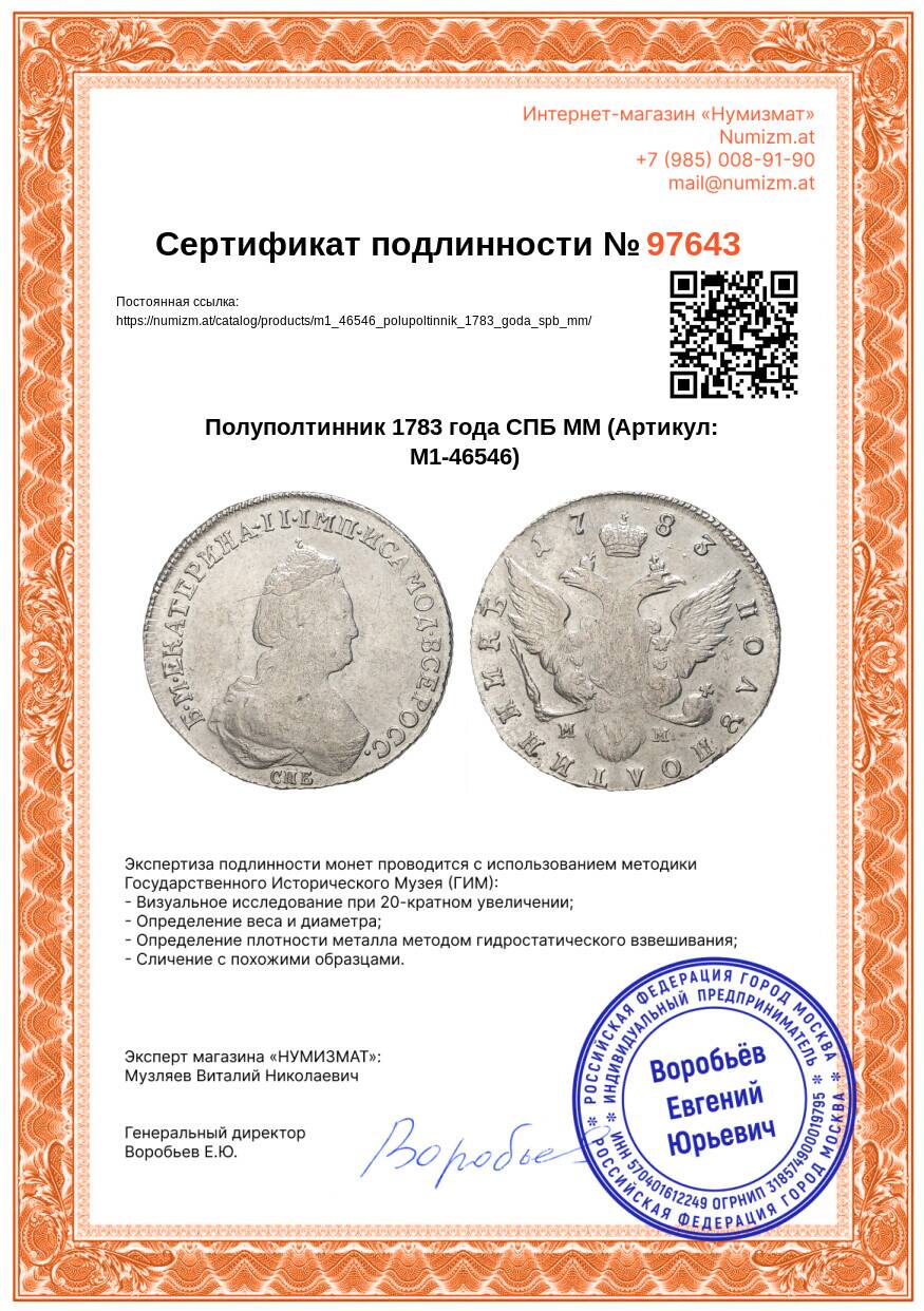 Купить Полуполтинник 1783 года СПБ ММ по привлекательной цене можно в нашем интернет-магазине — Вам достаточно оформить заказ на сайте. Все монеты, представленные в каталоге, находятся в наличии на нашем складе.