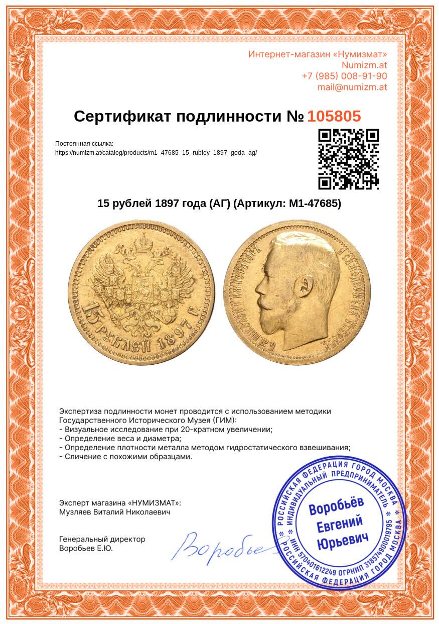 Купить 15 рублей 1897 года (АГ) по привлекательной цене можно в нашем интернет-магазине — Вам достаточно оформить заказ на сайте. Все монеты, представленные в каталоге, находятся в наличии на нашем складе.