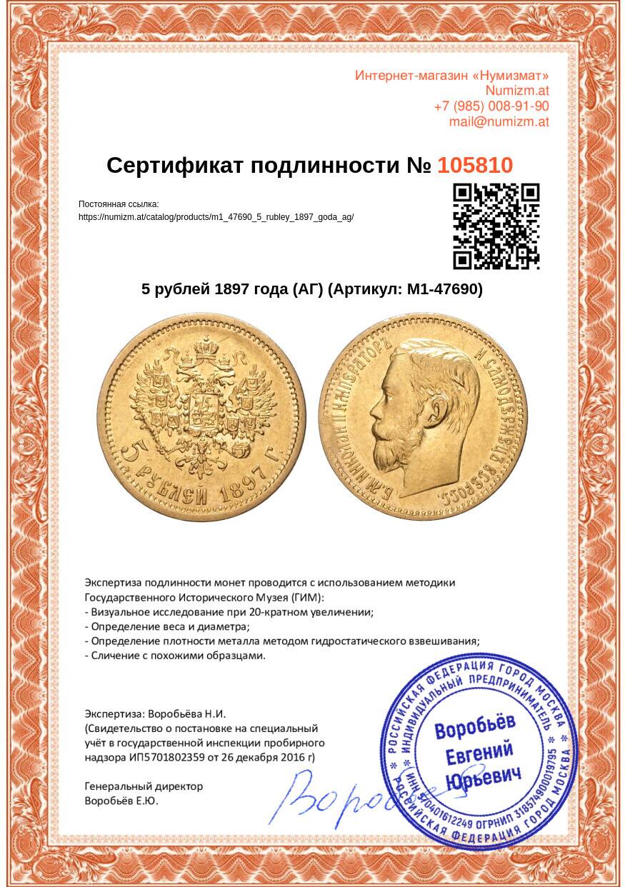 Купить 5 рублей 1897 года (АГ) по привлекательной цене можно в нашем интернет-магазине — Вам достаточно оформить заказ на сайте. Все монеты, представленные в каталоге, находятся в наличии на нашем складе.