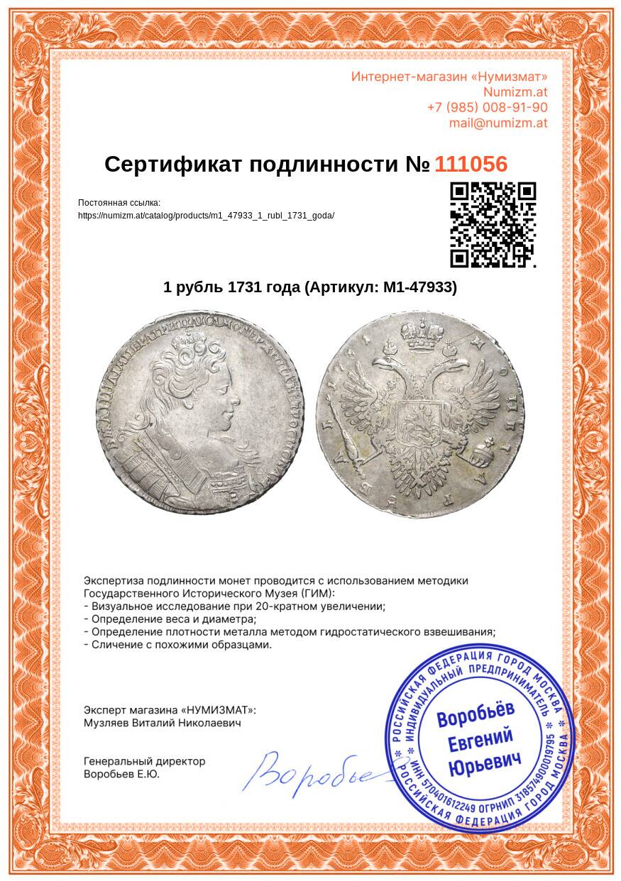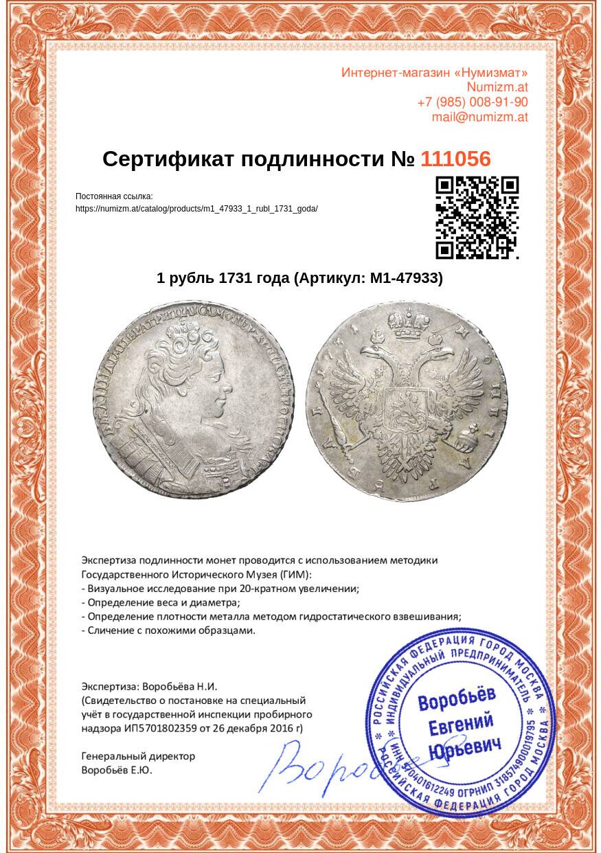 Купить 1 рубль 1731 года по привлекательной цене можно в нашем интернет-магазине — Вам достаточно оформить заказ на сайте. Все монеты, представленные в каталоге, находятся в наличии на нашем складе.