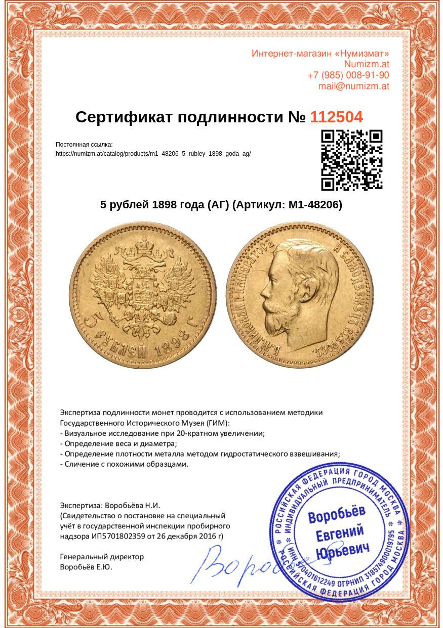 Монета 5 рублей 1898 года (АГ) (Артикул: M1-48206): подробные характеристики, качественные фотографии в высоком разрешении, низкая цена.