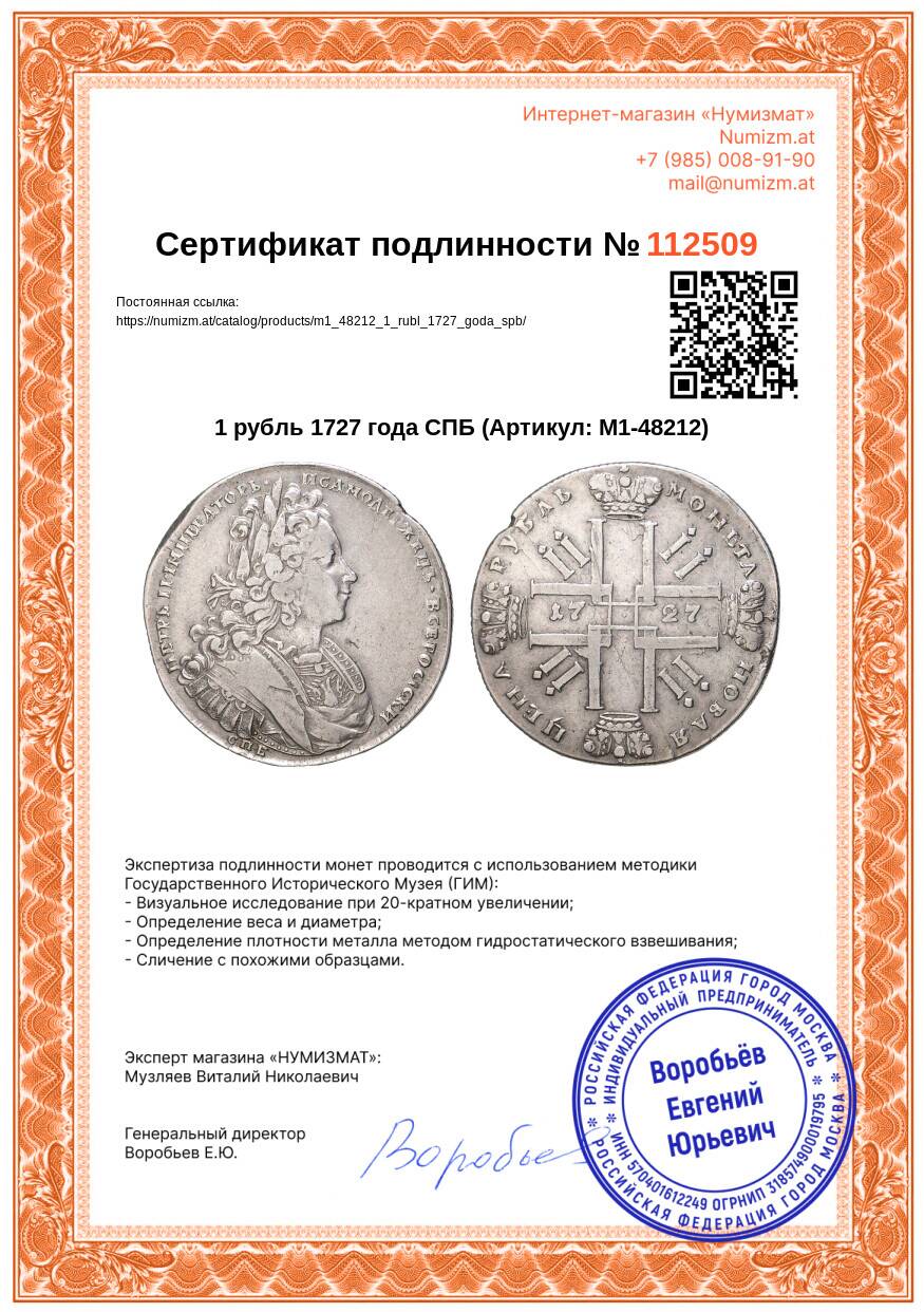 20.01.2025Интернет магазин «Нумизмат» предлагает приобрести 1 рубль 1727 года СПБ.