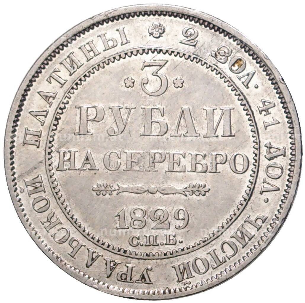 Купить 3 рубля 1829 года СПБ по привлекательной цене можно в нашем интернет-магазине — Вам достаточно оформить заказ на сайте. Все монеты, представленные в каталоге, находятся в наличии на нашем складе.