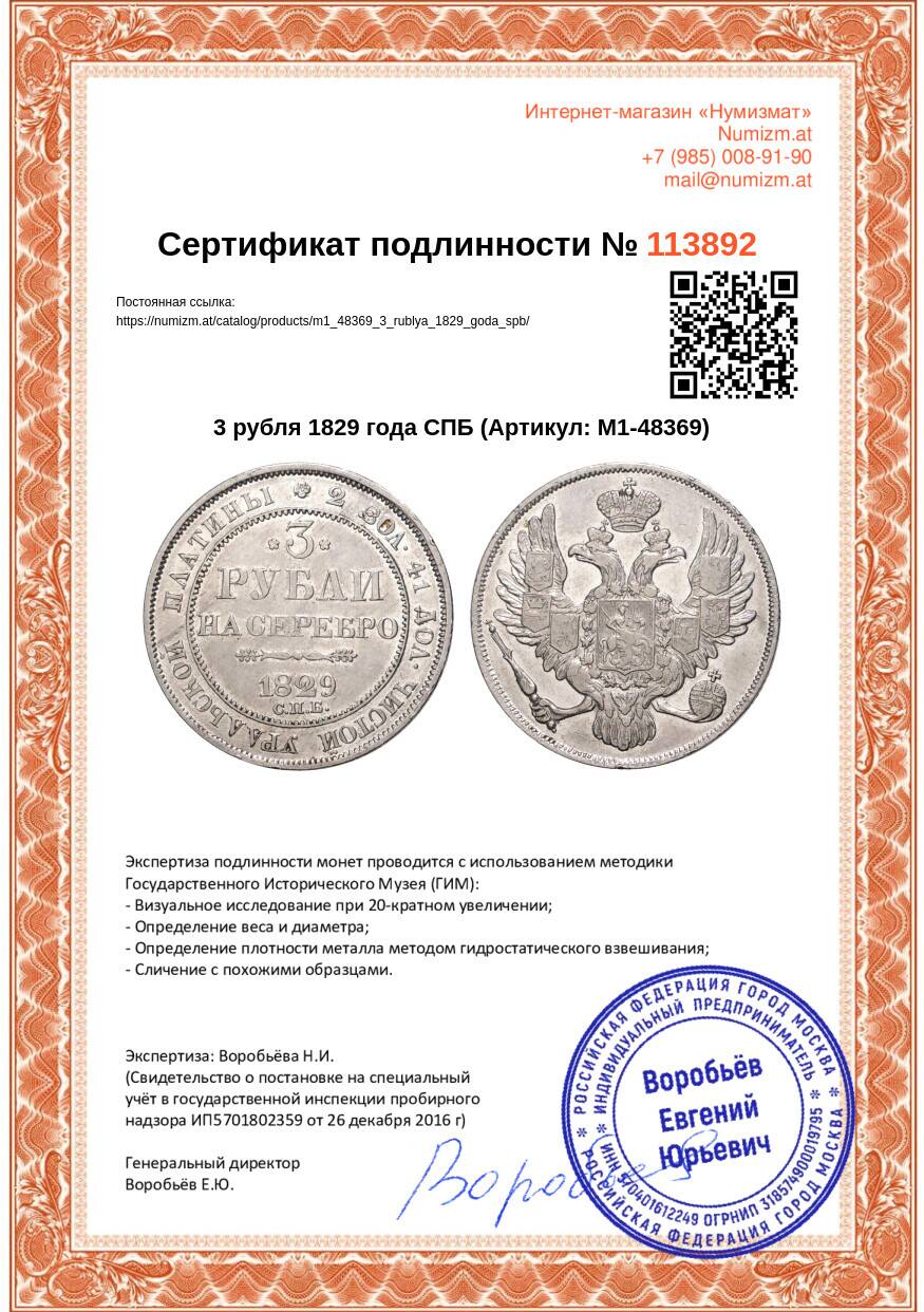 20.01.2025Интернет магазин «Нумизмат» предлагает приобрести 3 рубля 1829 года СПБ.