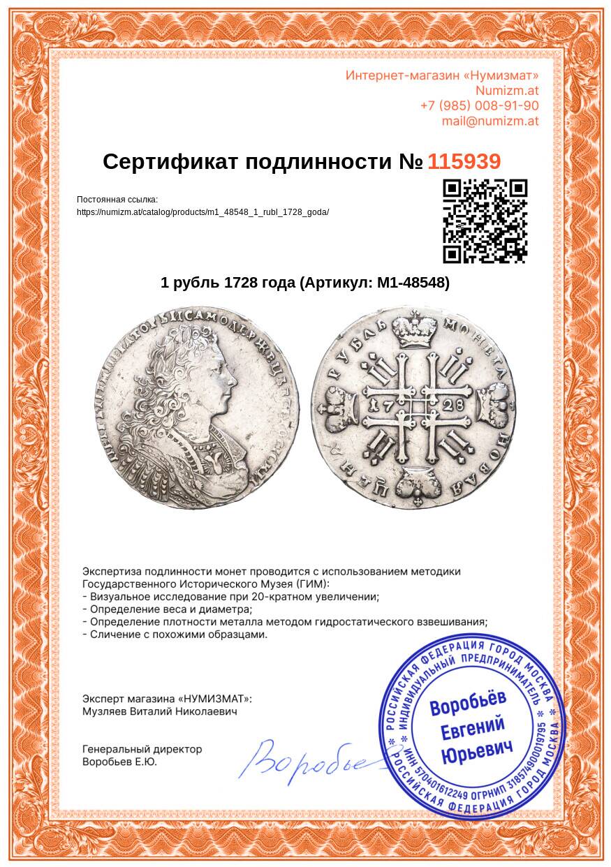 20.01.2025Интернет магазин «Нумизмат» предлагает приобрести 1 рубль 1728 года.