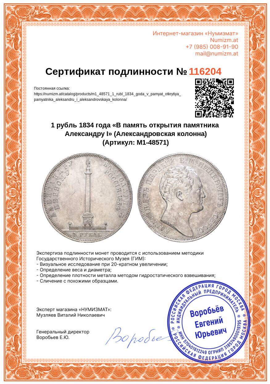 Купить 1 рубль 1834 года «В память открытия памятника Александру I» (Александровская колонна) по привлекательной цене можно в нашем интернет-магазине — Вам достаточно оформить заказ на сайте. Все монеты, представленные в каталоге, находятся в наличии на нашем складе.