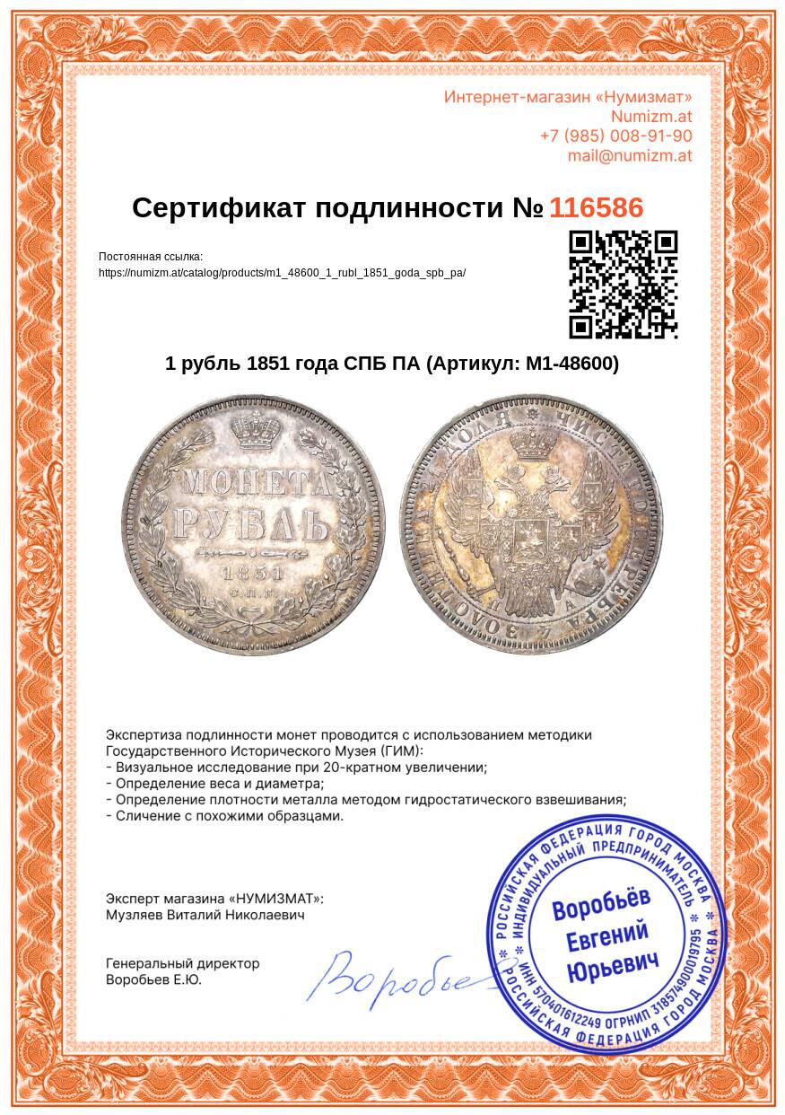 20.01.2025Интернет магазин «Нумизмат» предлагает приобрести 1 рубль 1851 года СПБ ПА.
