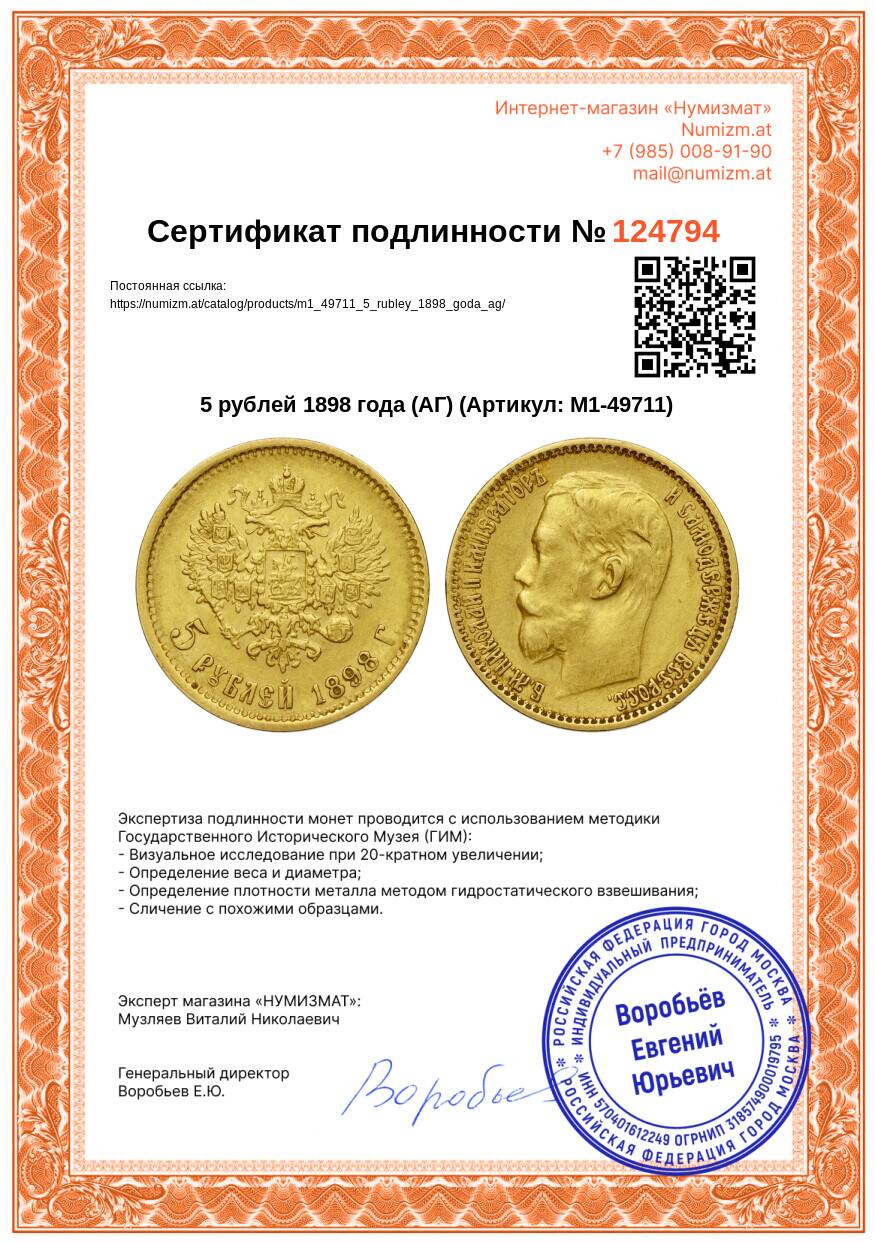 Купить 5 рублей 1898 года (АГ) по привлекательной цене можно в нашем интернет-магазине — Вам достаточно оформить заказ на сайте. Все монеты, представленные в каталоге, находятся в наличии на нашем складе.