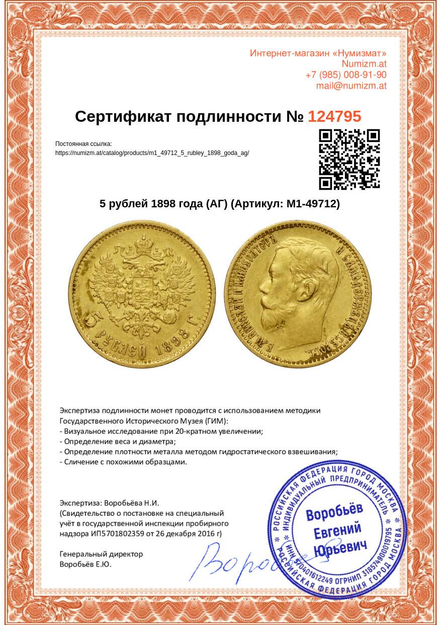 Купить 5 рублей 1898 года (АГ) по привлекательной цене можно в нашем интернет-магазине — Вам достаточно оформить заказ на сайте. Все монеты, представленные в каталоге, находятся в наличии на нашем складе.