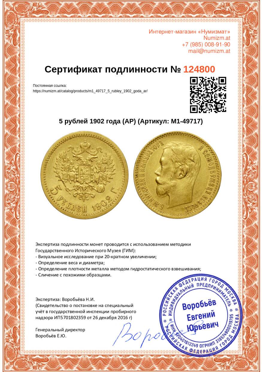 Купить 5 рублей 1902 года (АР) по привлекательной цене можно в нашем интернет-магазине — Вам достаточно оформить заказ на сайте. Все монеты, представленные в каталоге, находятся в наличии на нашем складе.