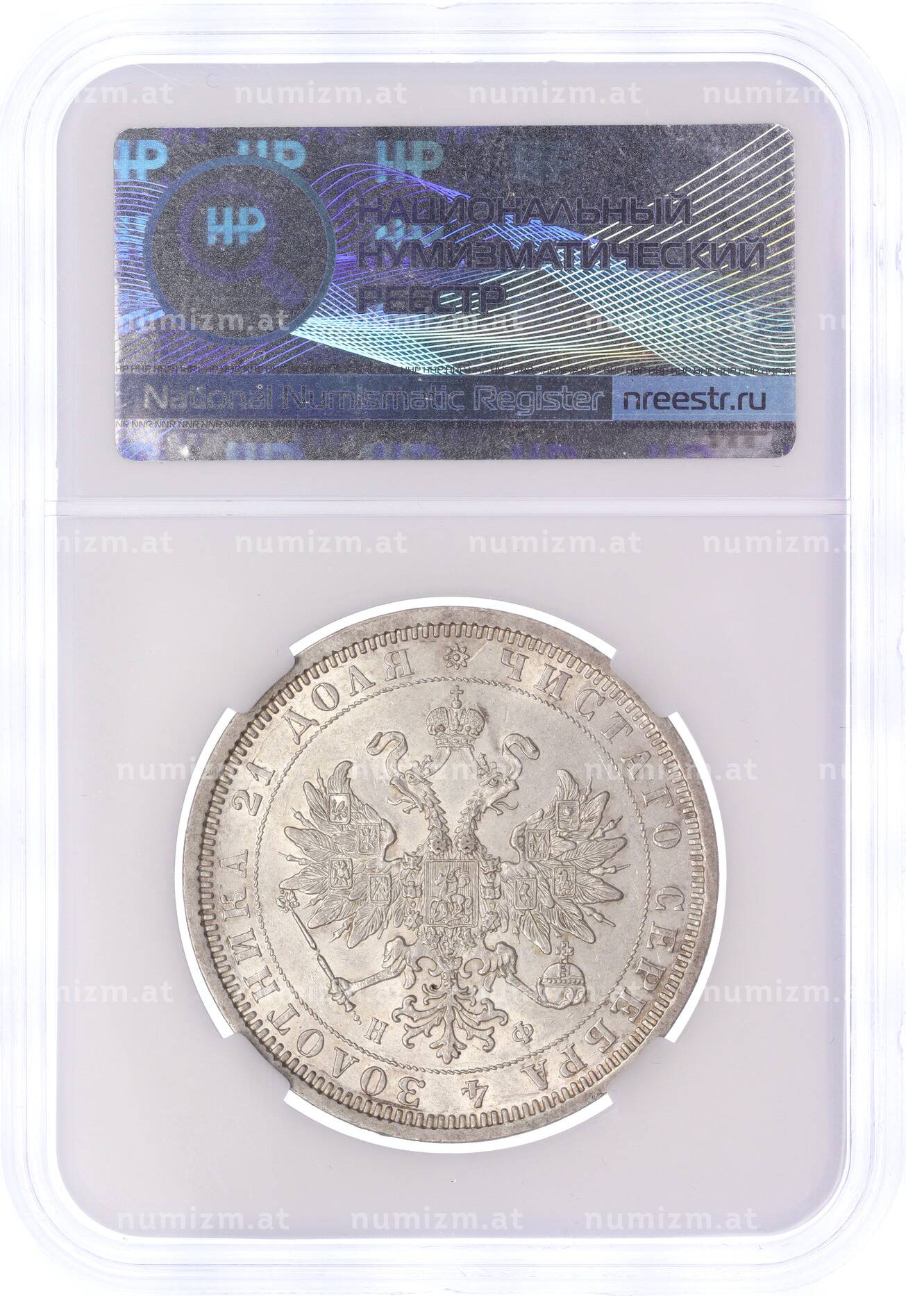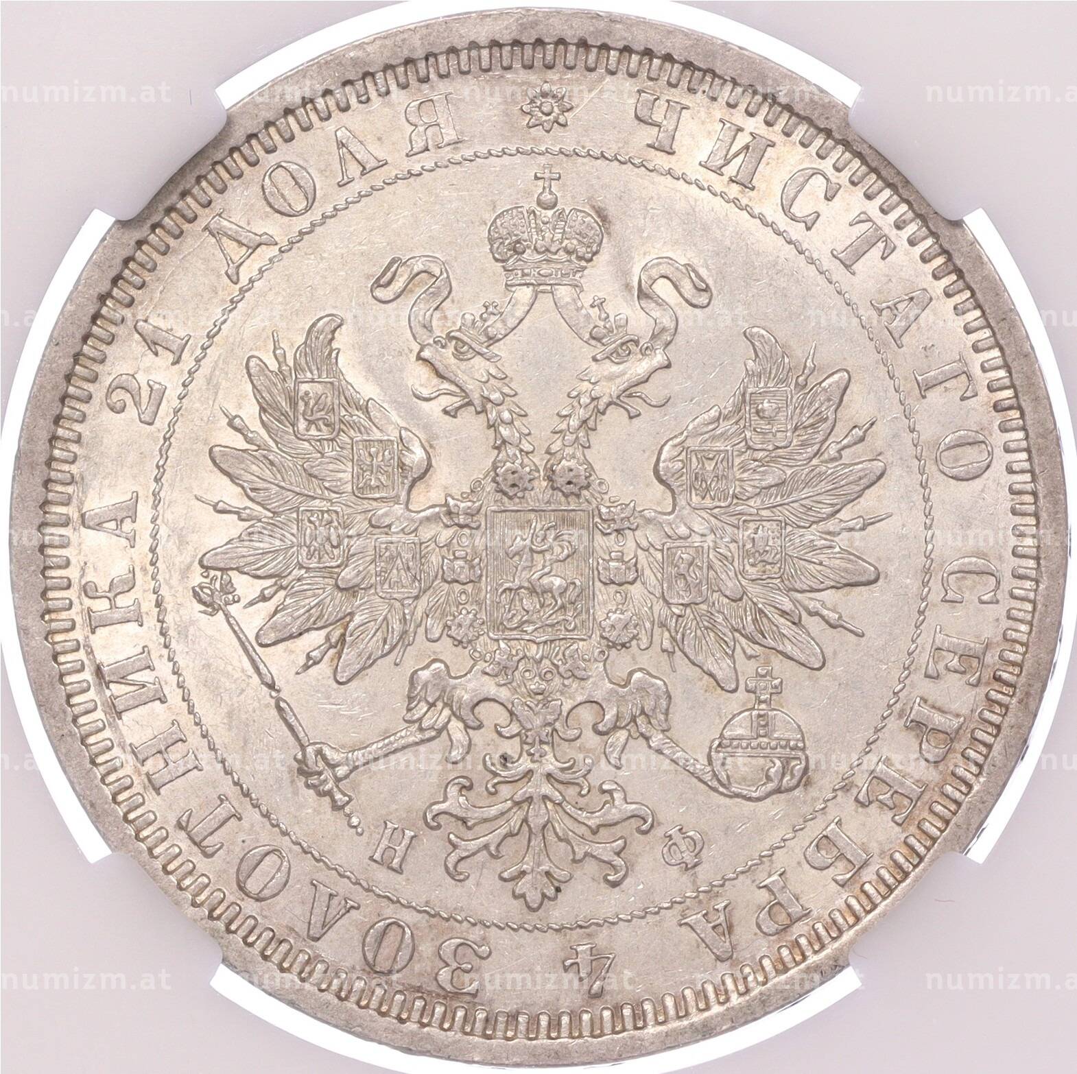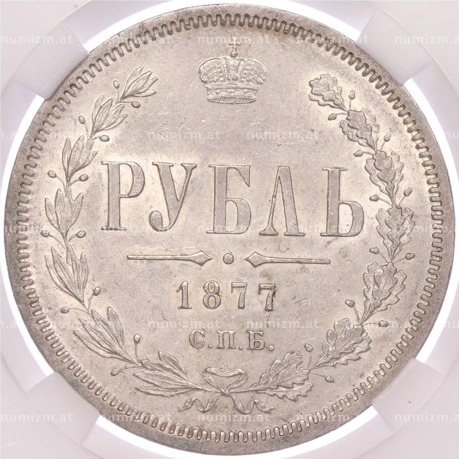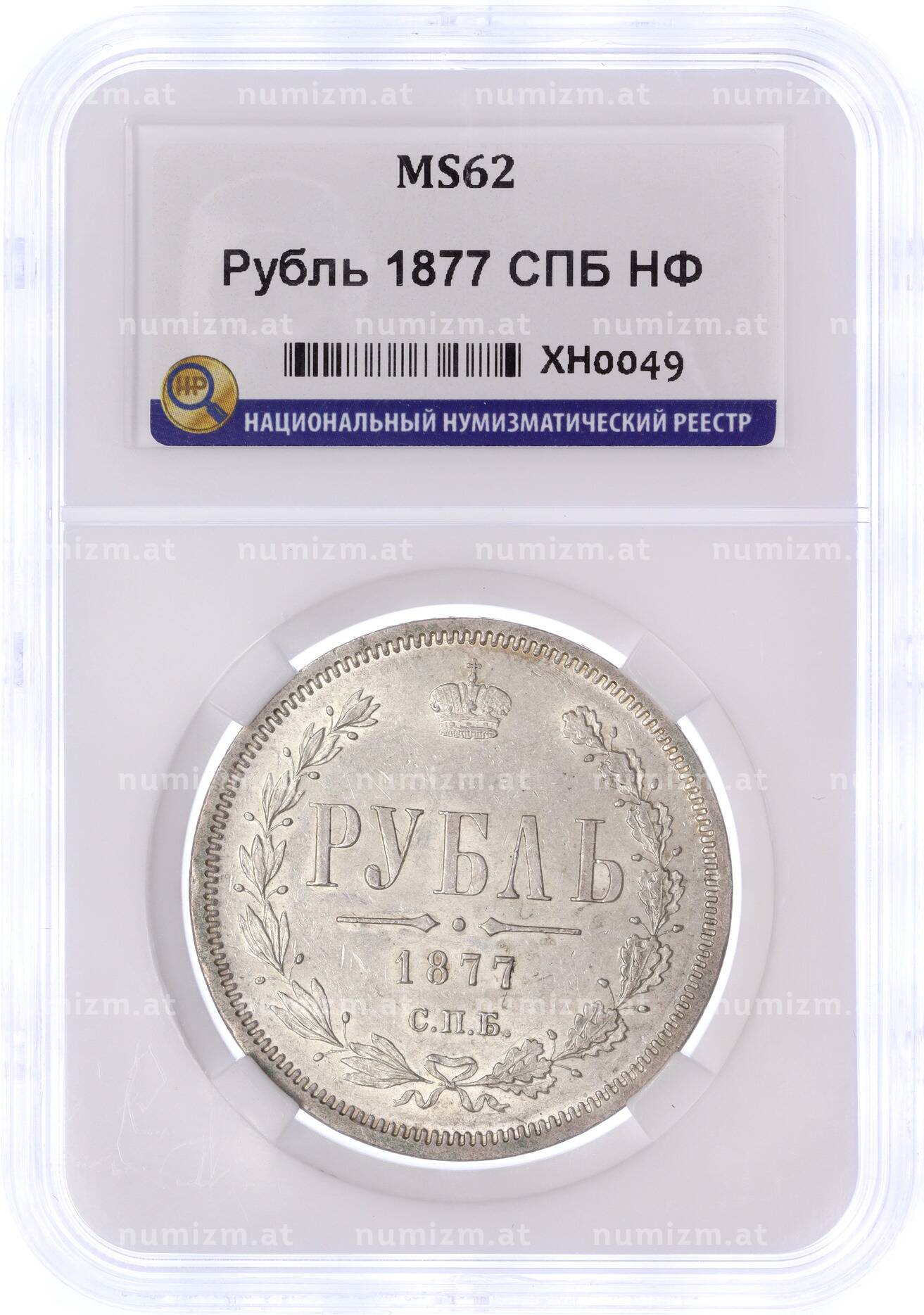Купить 1 рубль 1877 года СПБ НФ — в слабе ННР (MS62) по привлекательной цене можно в нашем интернет-магазине — Вам достаточно оформить заказ на сайте. Все монеты, представленные в каталоге, находятся в наличии на нашем складе.