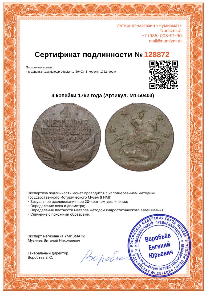 20.01.2025Интернет магазин «Нумизмат» предлагает приобрести 4 копейки 1762 года.
