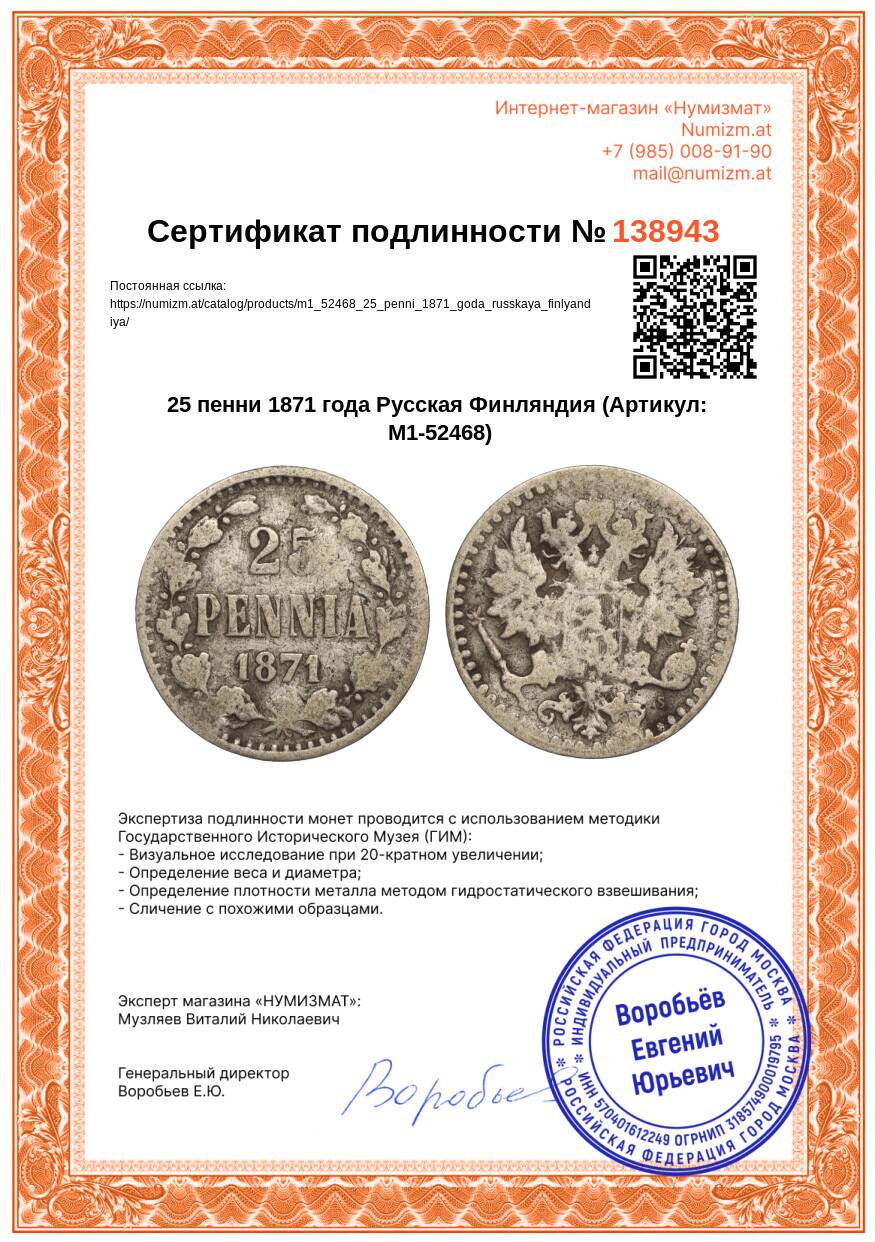 20.01.2025Интернет магазин «Нумизмат» предлагает приобрести 25 пенни 1871 года Русская Финляндия.