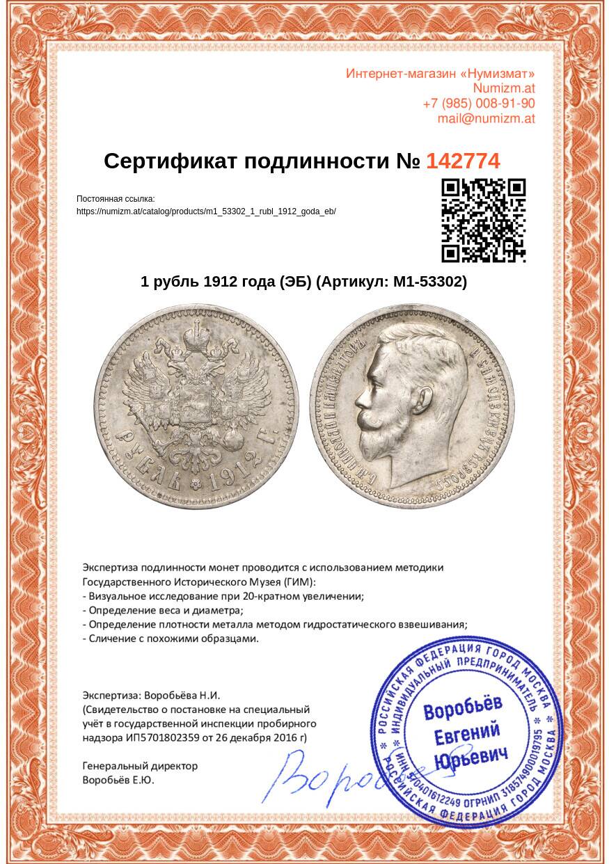 Монета 1 рубль 1912 года (ЭБ) (Артикул: M1-53302): подробные характеристики, качественные фотографии в высоком разрешении, низкая цена.