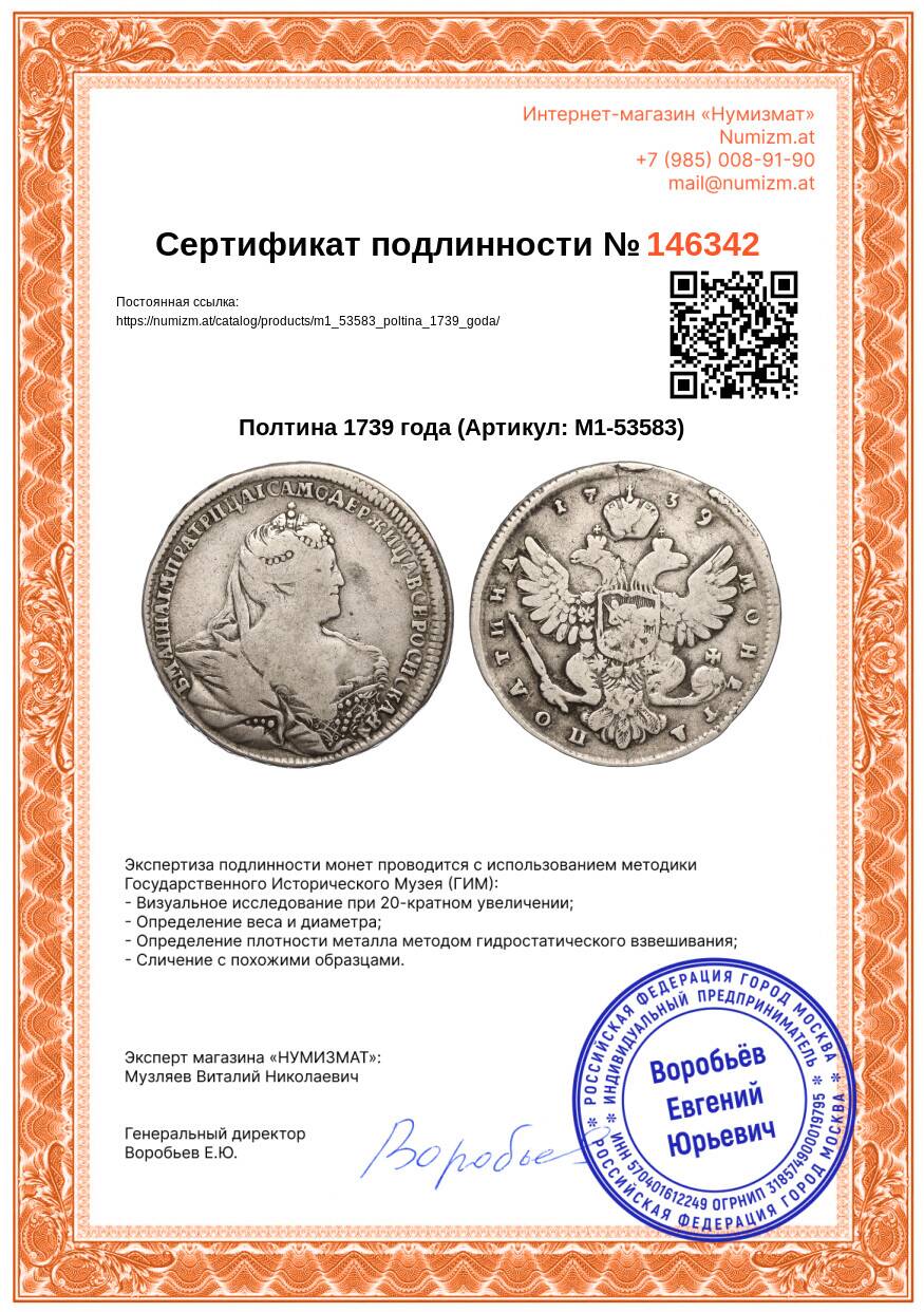 20.01.2025Интернет магазин «Нумизмат» предлагает приобрести Полтина 1739 года.
