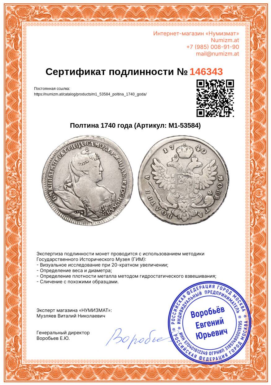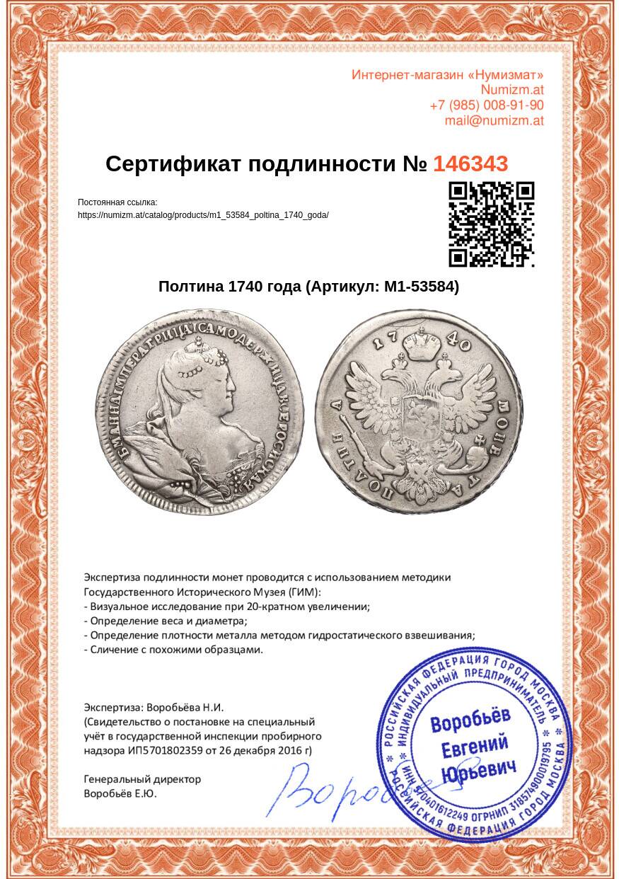 20.01.2025Интернет магазин «Нумизмат» предлагает приобрести Полтина 1740 года.