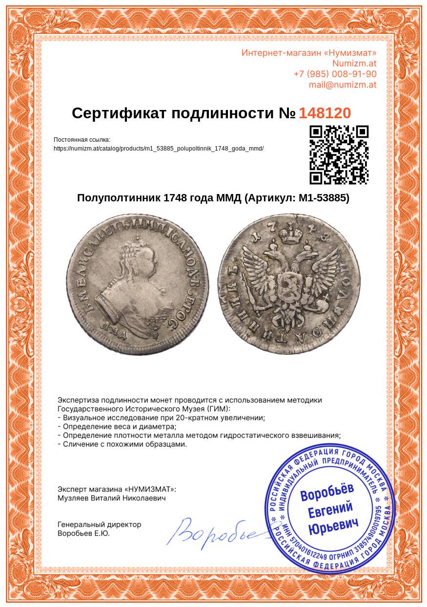 Купить Полуполтинник 1748 года ММД по привлекательной цене можно в нашем интернет-магазине — Вам достаточно оформить заказ на сайте. Все монеты, представленные в каталоге, находятся в наличии на нашем складе.