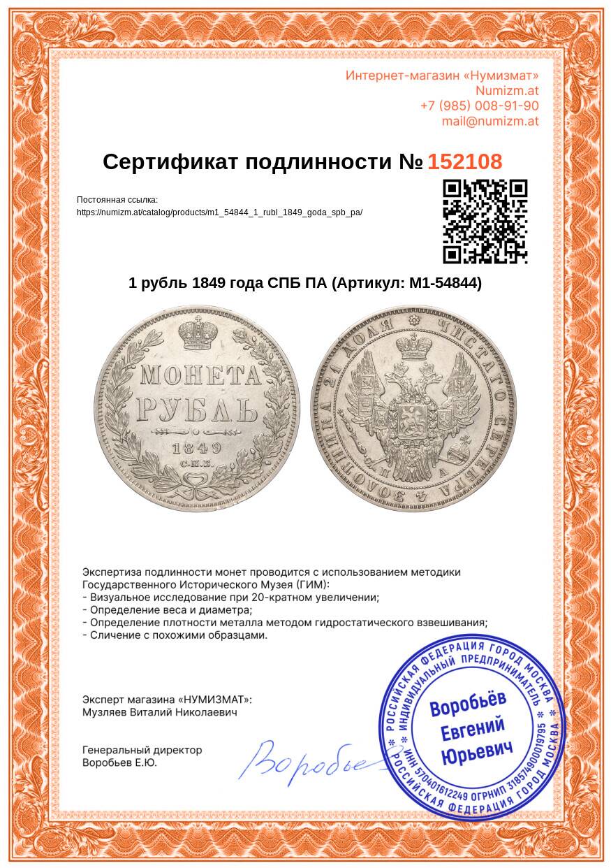 20.01.2025Интернет магазин «Нумизмат» предлагает приобрести 1 рубль 1849 года СПБ ПА.