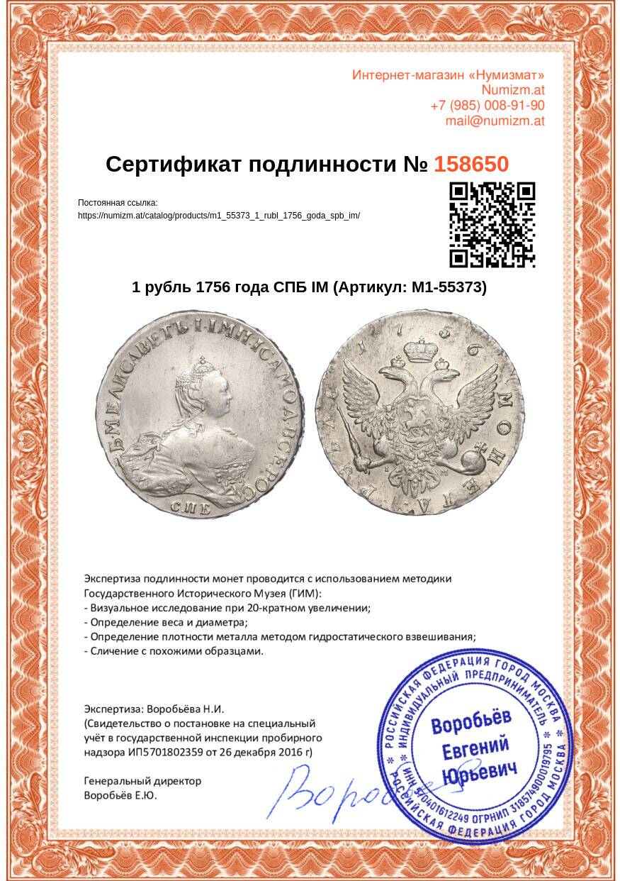 20.01.2025Интернет магазин «Нумизмат» предлагает приобрести 1 рубль 1756 года СПБ IМ.