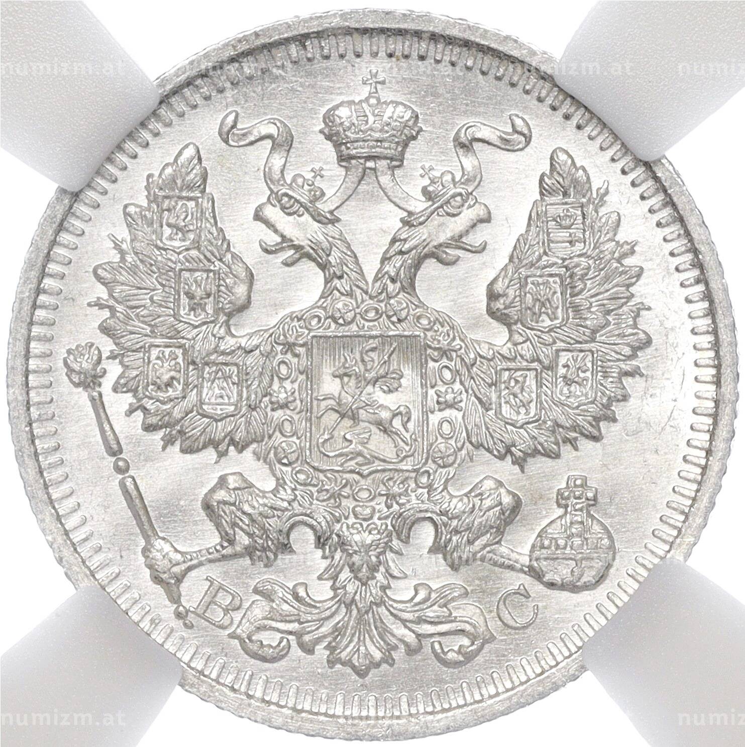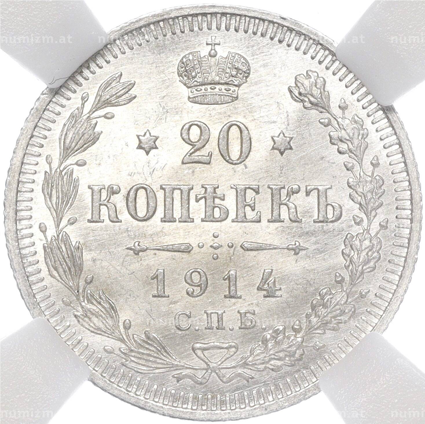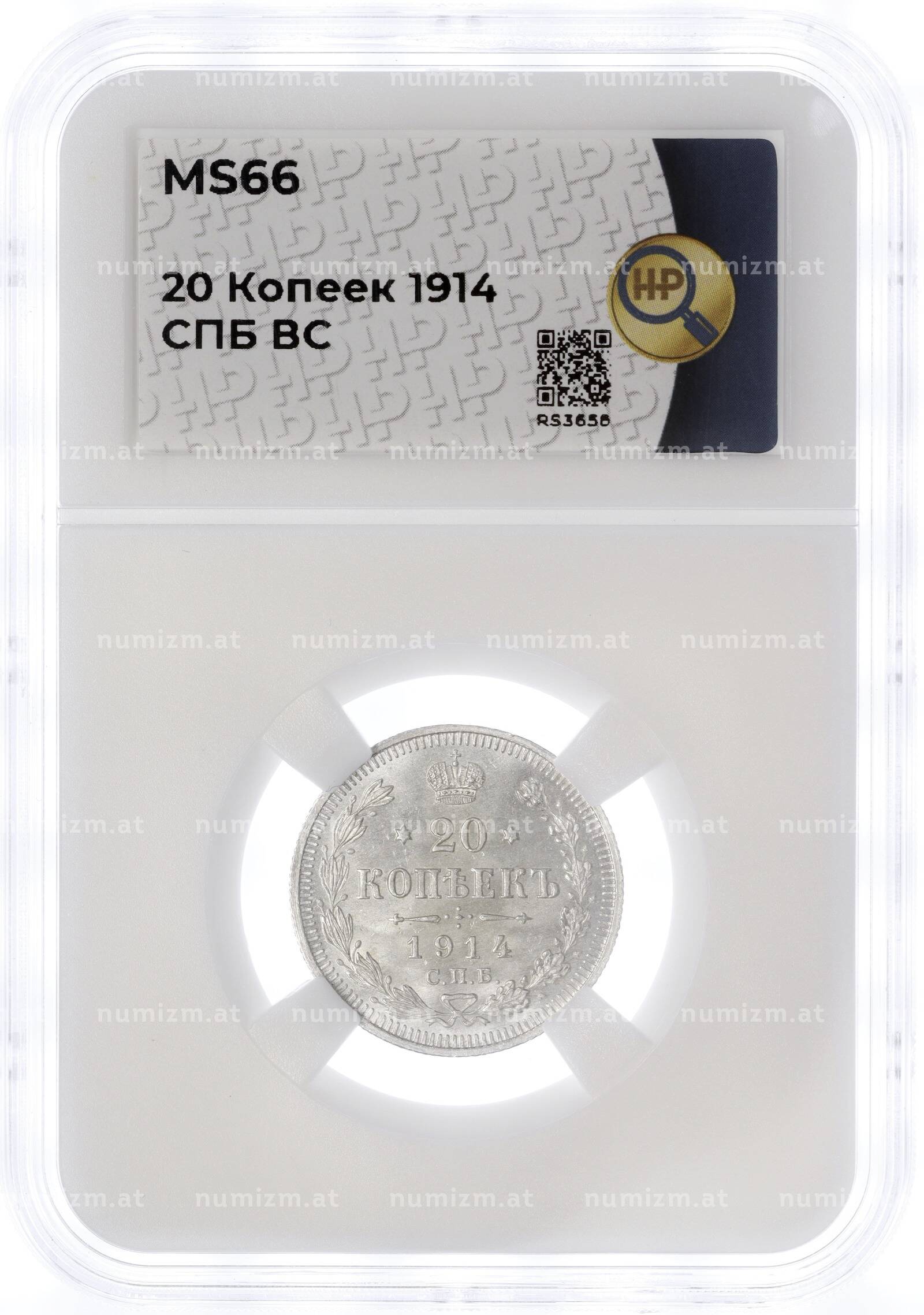 Купить 20 копеек 1914 года СПБ ВС — в слабе ННР (MS66) по привлекательной цене можно в нашем интернет-магазине — Вам достаточно оформить заказ на сайте. Все монеты, представленные в каталоге, находятся в наличии на нашем складе.