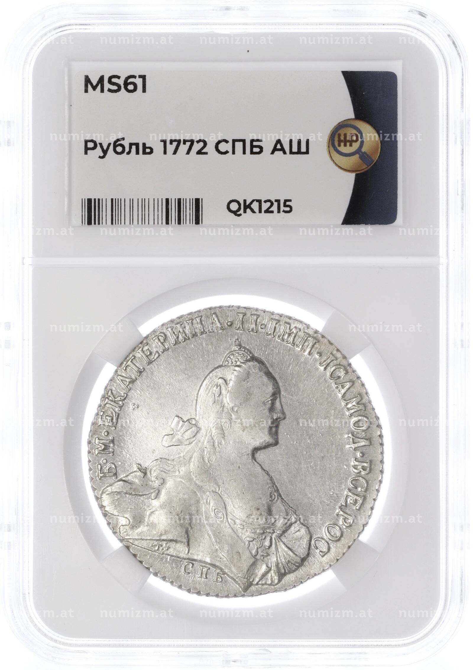 Купить 1 рубль 1772 года СПБ ТI АШ — в слабе ННР (MS61) по привлекательной цене можно в нашем интернет-магазине — Вам достаточно оформить заказ на сайте. Все монеты, представленные в каталоге, находятся в наличии на нашем складе.