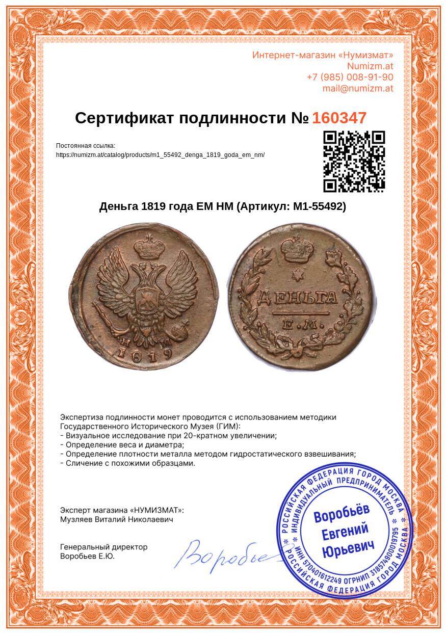 20.01.2025Интернет магазин «Нумизмат» предлагает приобрести Деньга 1819 года ЕМ НМ.