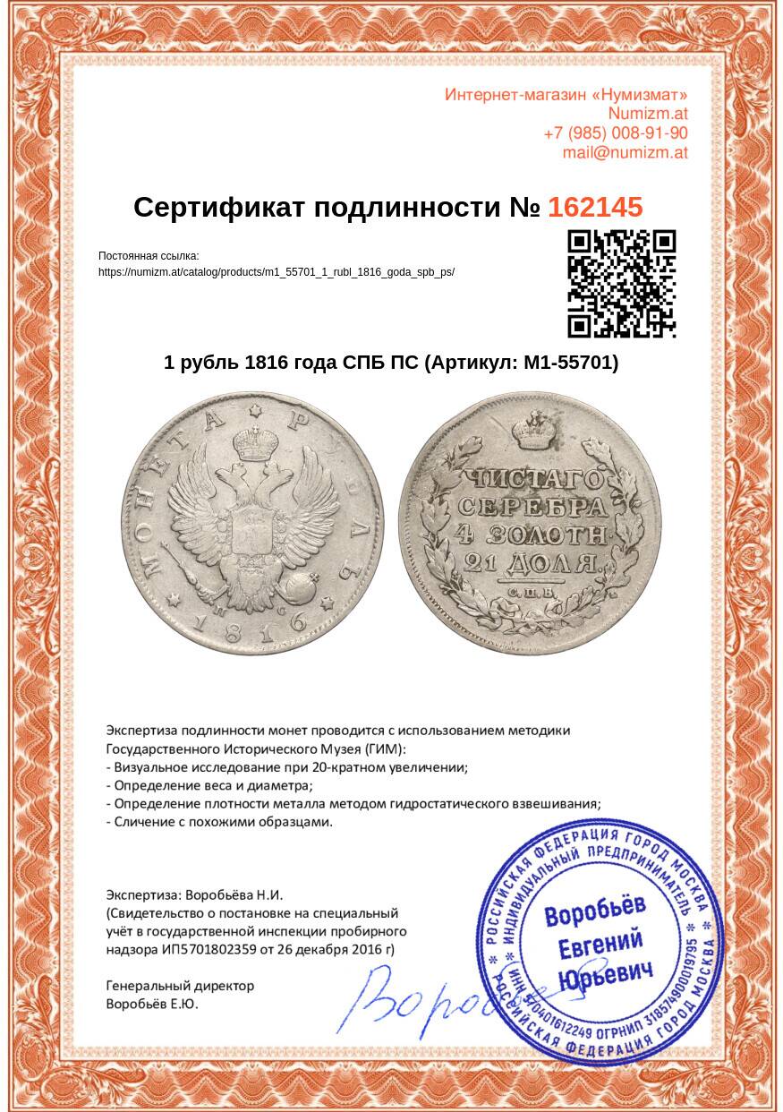 20.01.2025Интернет магазин «Нумизмат» предлагает приобрести 1 рубль 1816 года СПБ ПС.