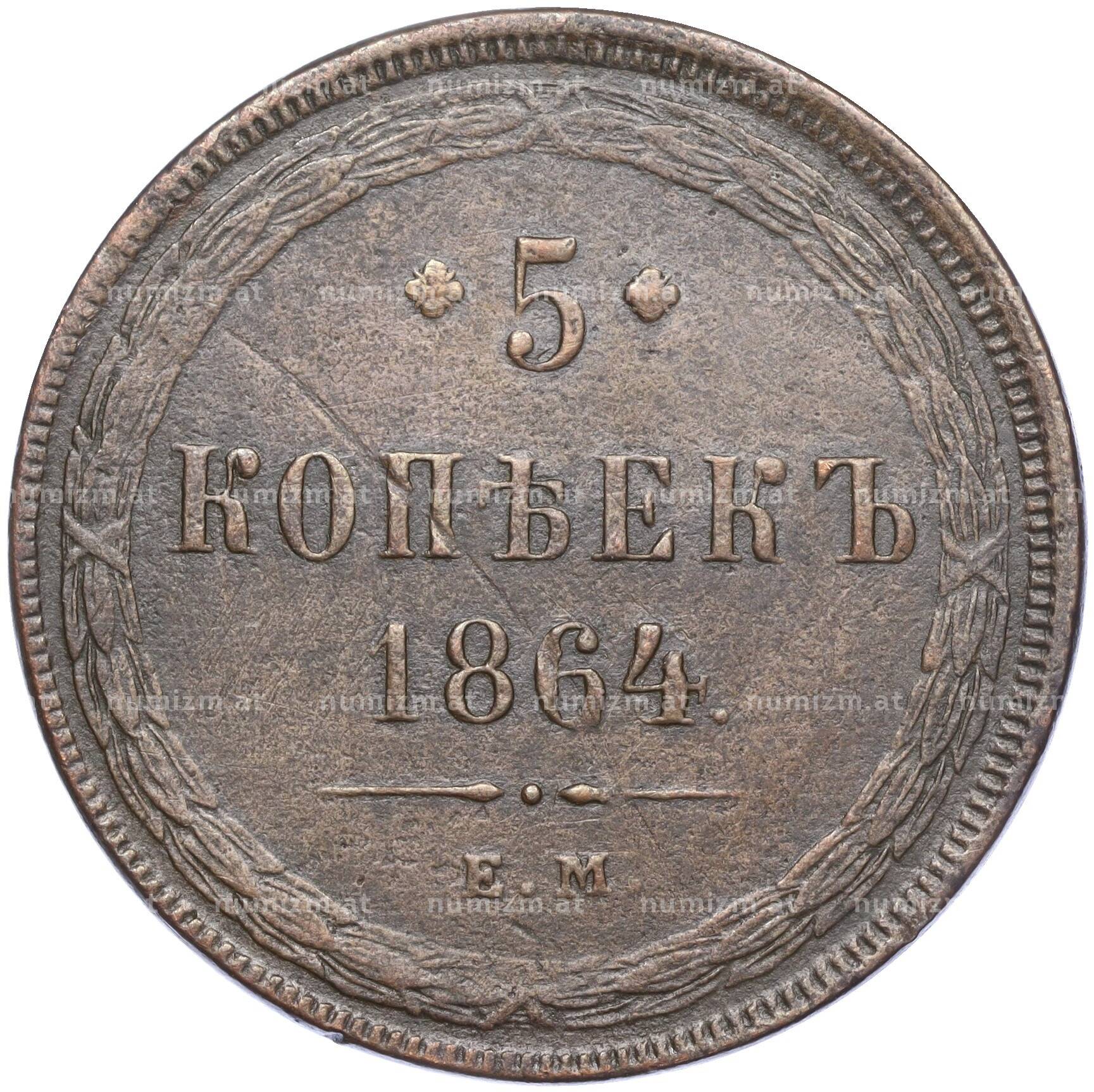 Купить 5 копеек 1864 года ЕМ по привлекательной цене можно в нашем интернет-магазине — Вам достаточно оформить заказ на сайте. Все монеты, представленные в каталоге, находятся в наличии на нашем складе.