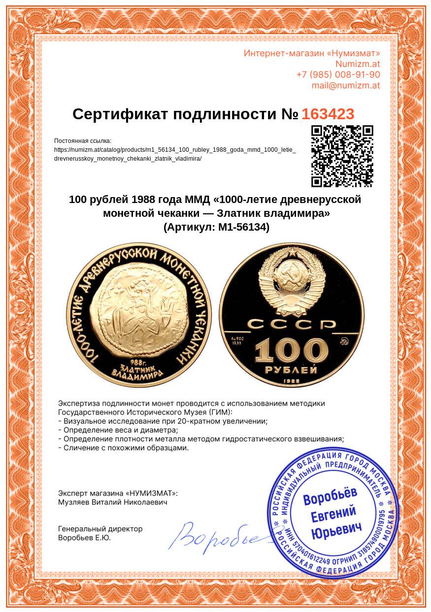 Купить 100 рублей 1988 года ММД «1000-летие древнерусской монетной чеканки — Златник владимира» по привлекательной цене можно в нашем интернет-магазине — Вам достаточно оформить заказ на сайте. Все монеты, представленные в каталоге, находятся в наличии на нашем складе.