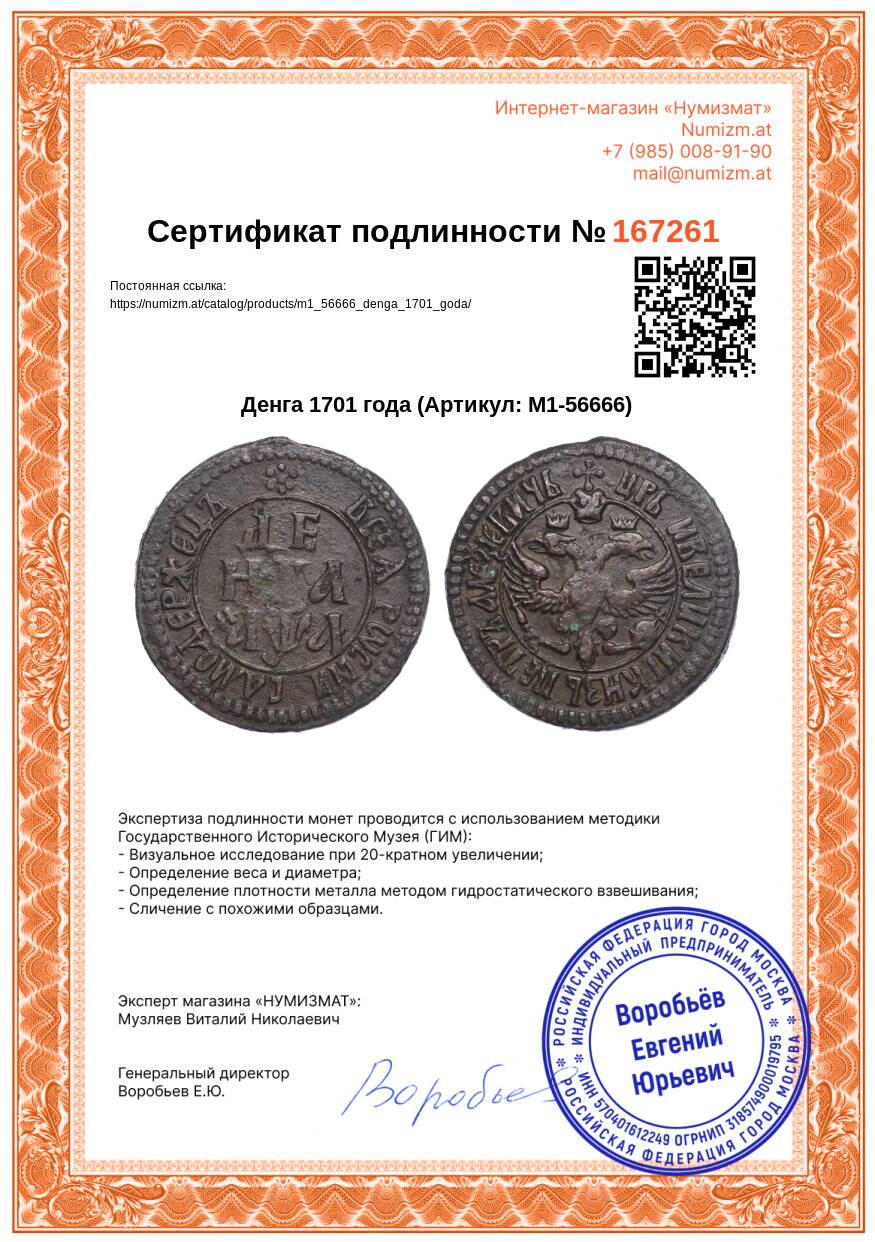 20.01.2025Интернет магазин «Нумизмат» предлагает приобрести Денга 1701 года.