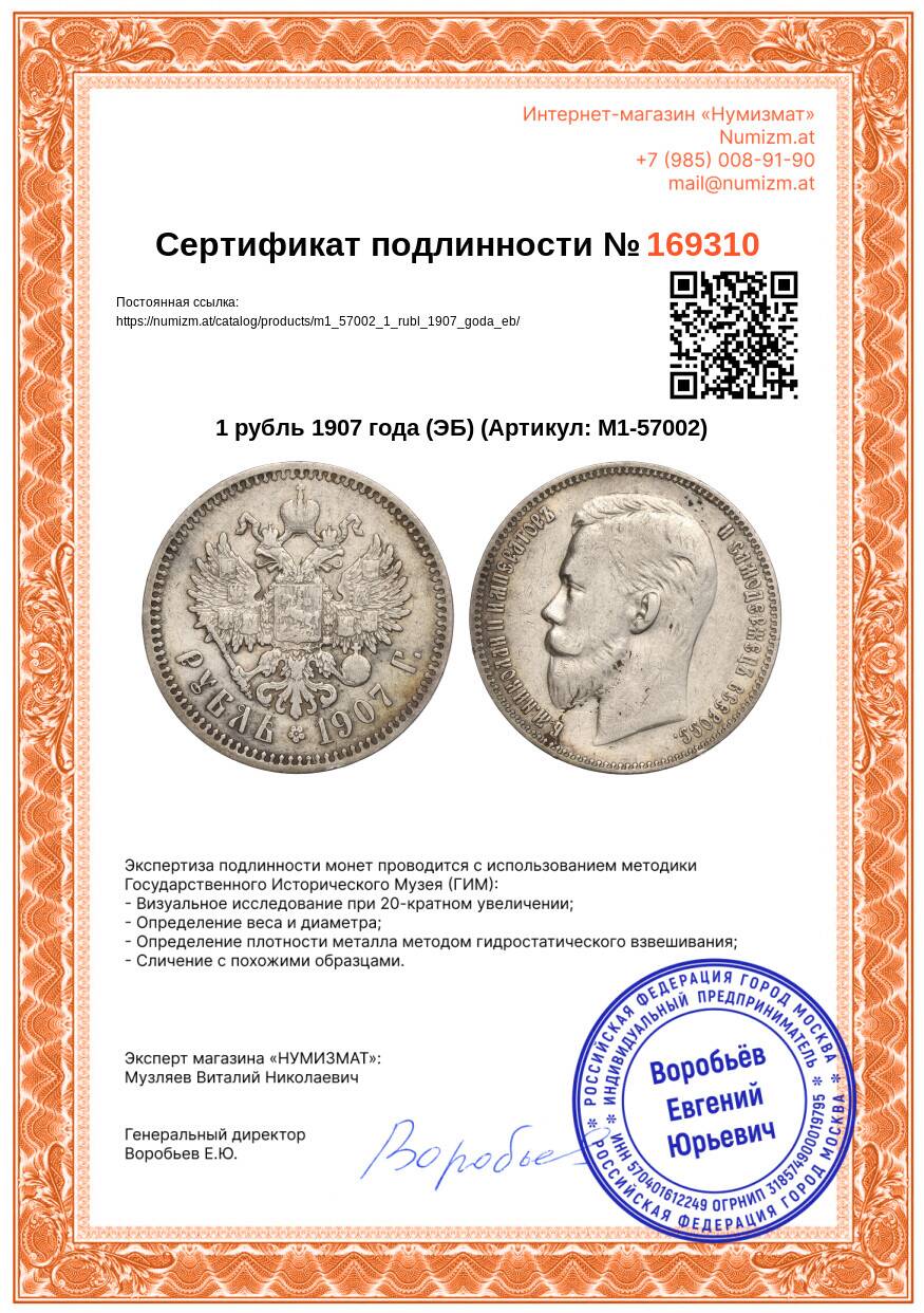 Монета 1 рубль 1907 года (ЭБ) (Артикул: M1-57002): подробные характеристики, качественные фотографии в высоком разрешении, низкая цена.