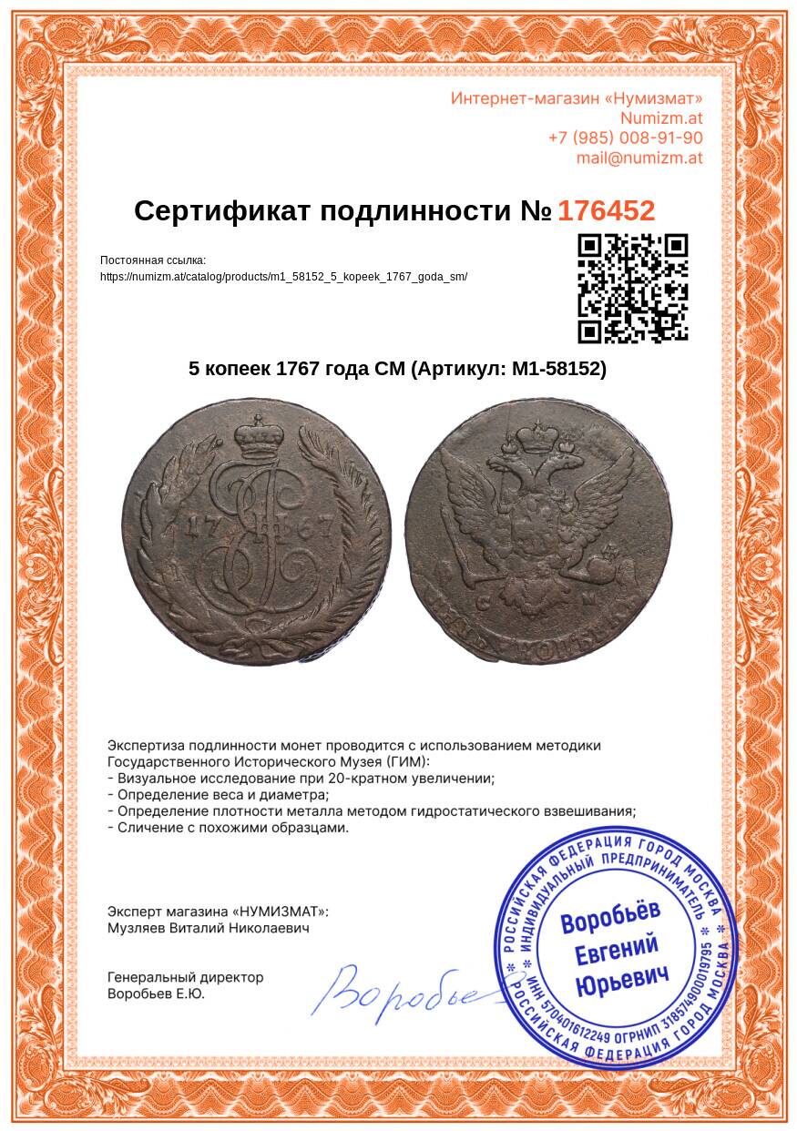 Купить 5 копеек 1767 года СМ по привлекательной цене можно в нашем интернет-магазине — Вам достаточно оформить заказ на сайте. Все монеты, представленные в каталоге, находятся в наличии на нашем складе.