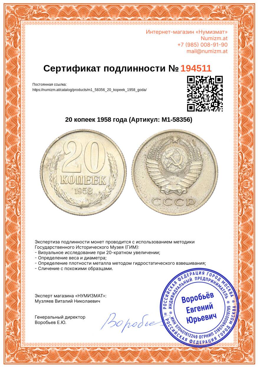Купить 20 копеек 1958 года по привлекательной цене можно в нашем интернет-магазине — Вам достаточно оформить заказ на сайте. Все монеты, представленные в каталоге, находятся в наличии на нашем складе.