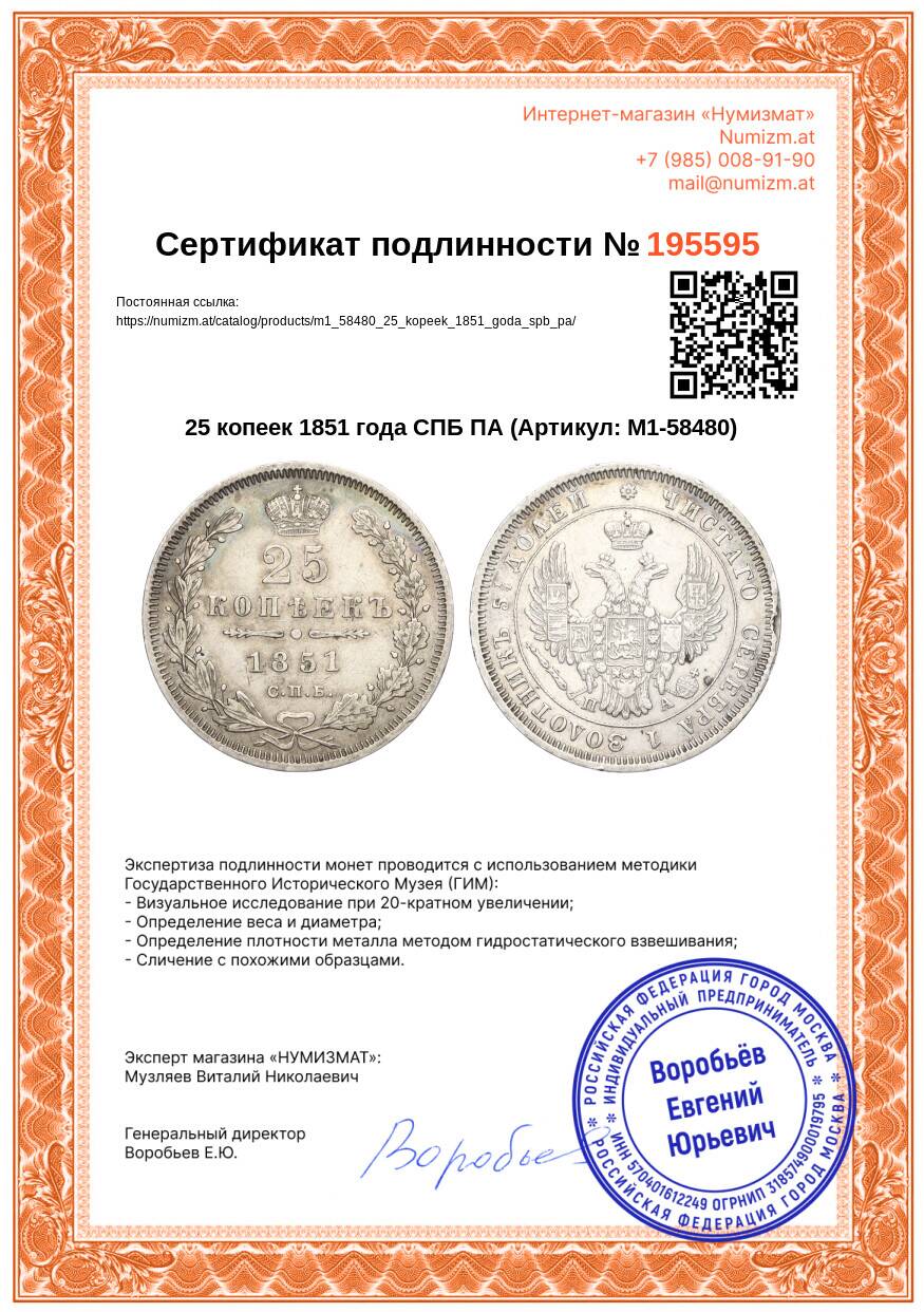 20.01.2025Интернет магазин «Нумизмат» предлагает приобрести 25 копеек 1851 года СПБ ПА.