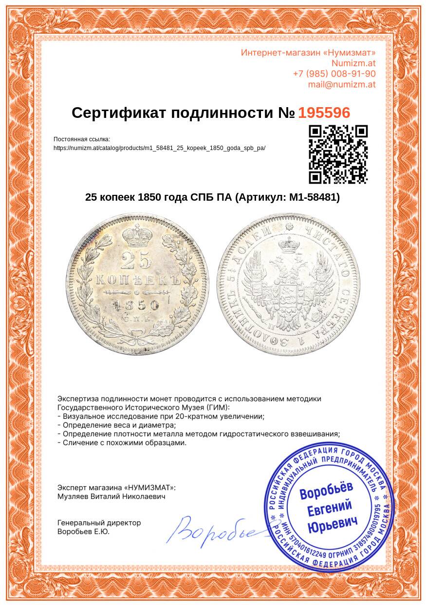 20.01.2025Интернет магазин «Нумизмат» предлагает приобрести 25 копеек 1850 года СПБ ПА.