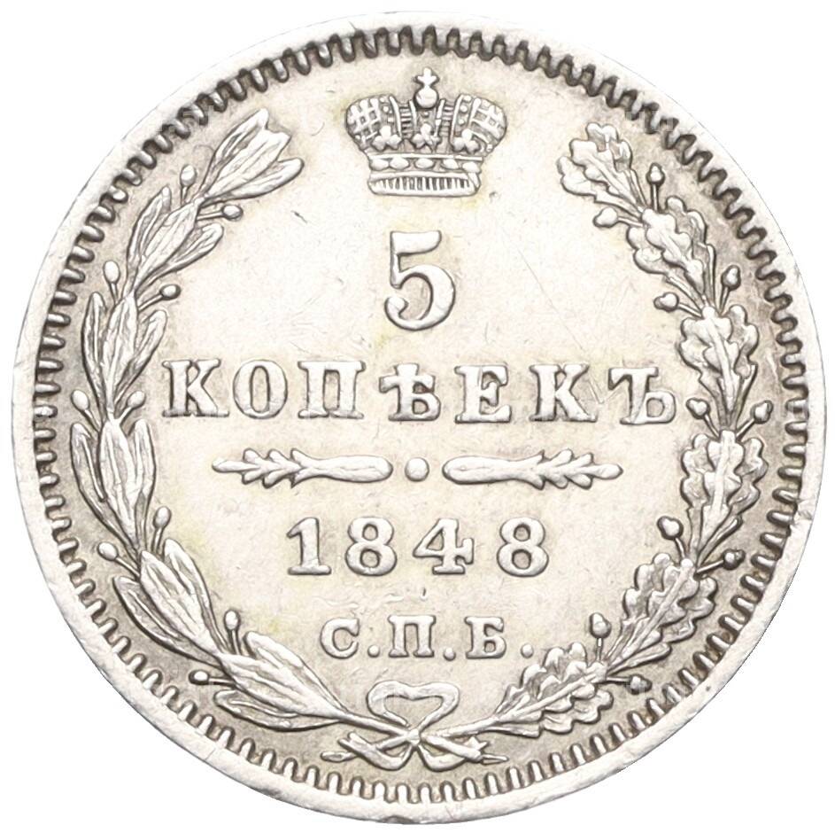 Купить 5 копеек 1848 года СПБ НI по привлекательной цене можно в нашем интернет-магазине — Вам достаточно оформить заказ на сайте. Все монеты, представленные в каталоге, находятся в наличии на нашем складе.