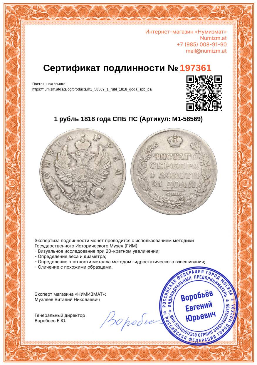 20.01.2025Интернет магазин «Нумизмат» предлагает приобрести 1 рубль 1818 года СПБ ПС.