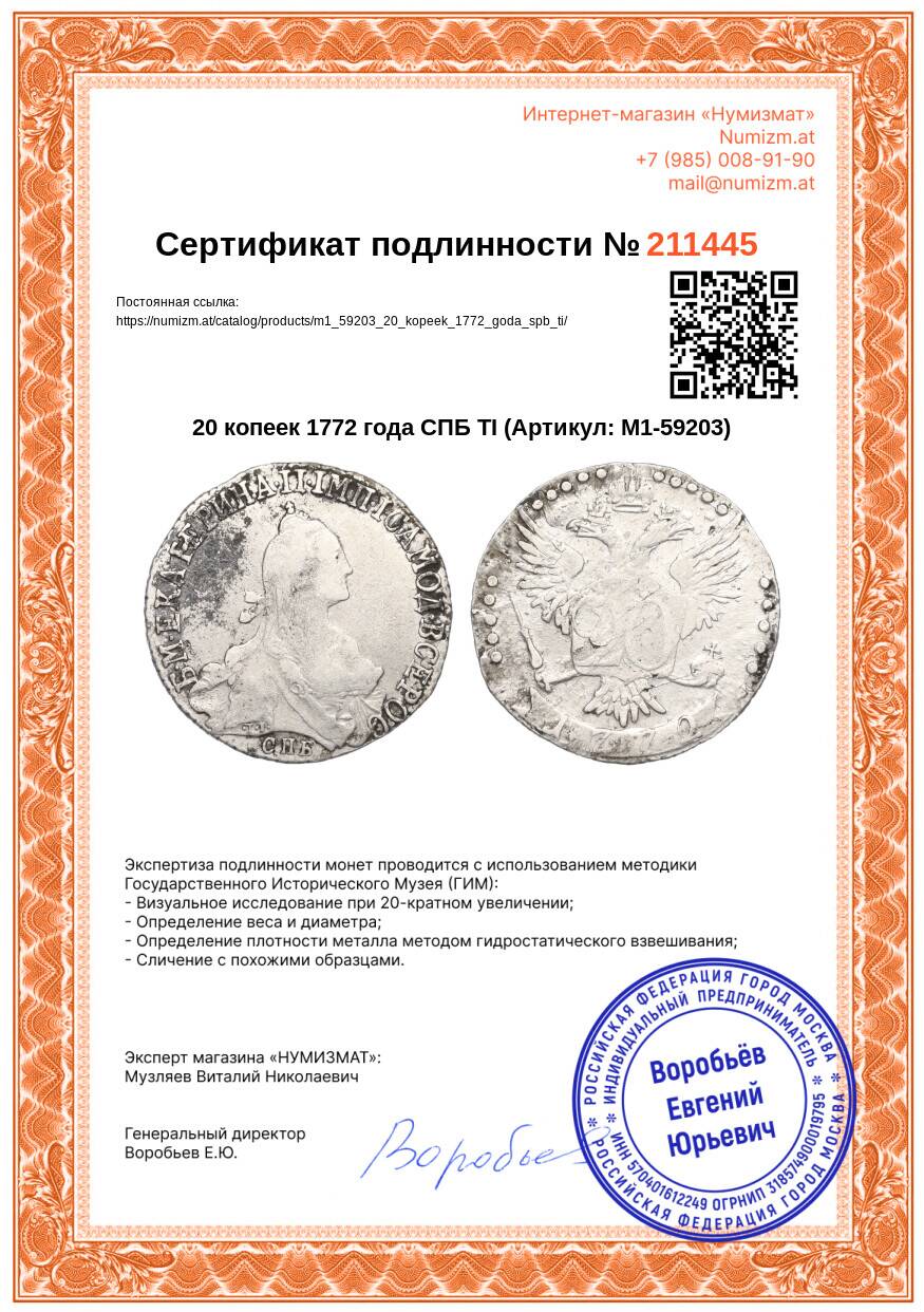 Купить 20 копеек 1772 года СПБ ТI по привлекательной цене можно в нашем интернет-магазине — Вам достаточно оформить заказ на сайте. Все монеты, представленные в каталоге, находятся в наличии на нашем складе.