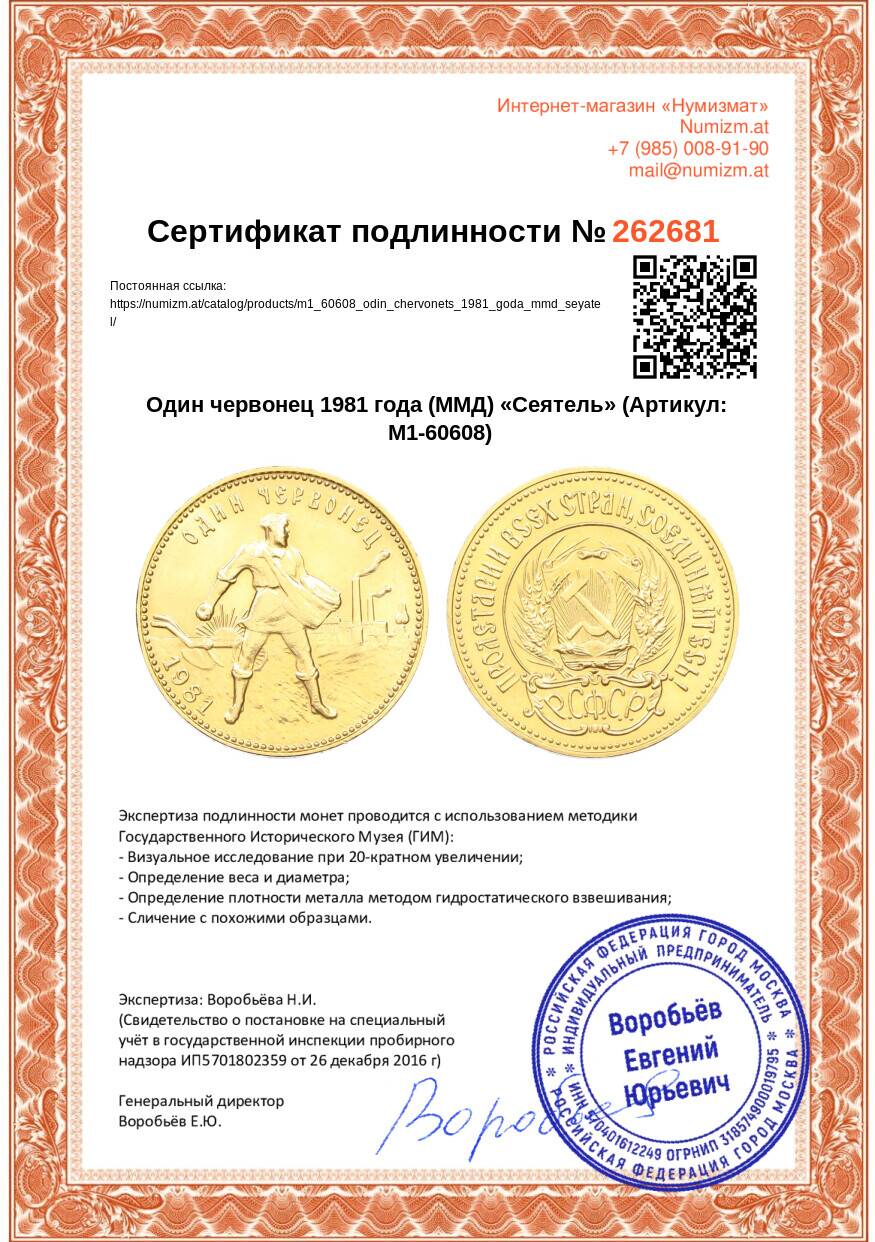 20.01.2025Интернет магазин «Нумизмат» предлагает приобрести Один червонец 1981 года (ММД) «Сеятель».